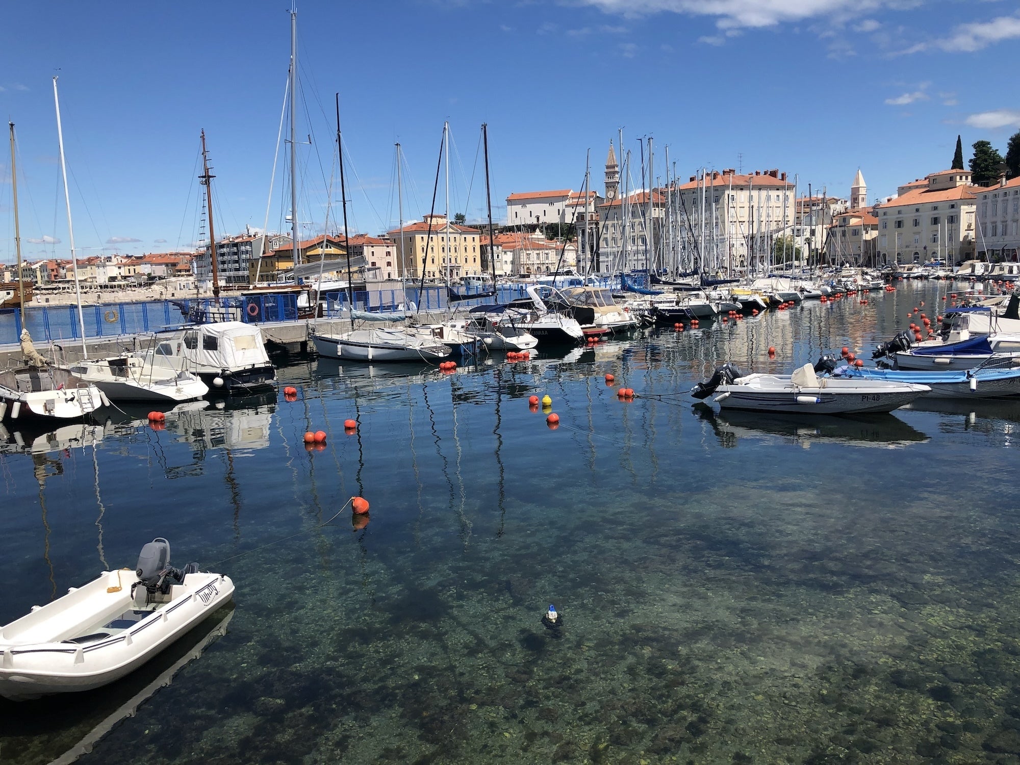 太陽が輝く海辺の街ピランの海は透き通って底まで見える