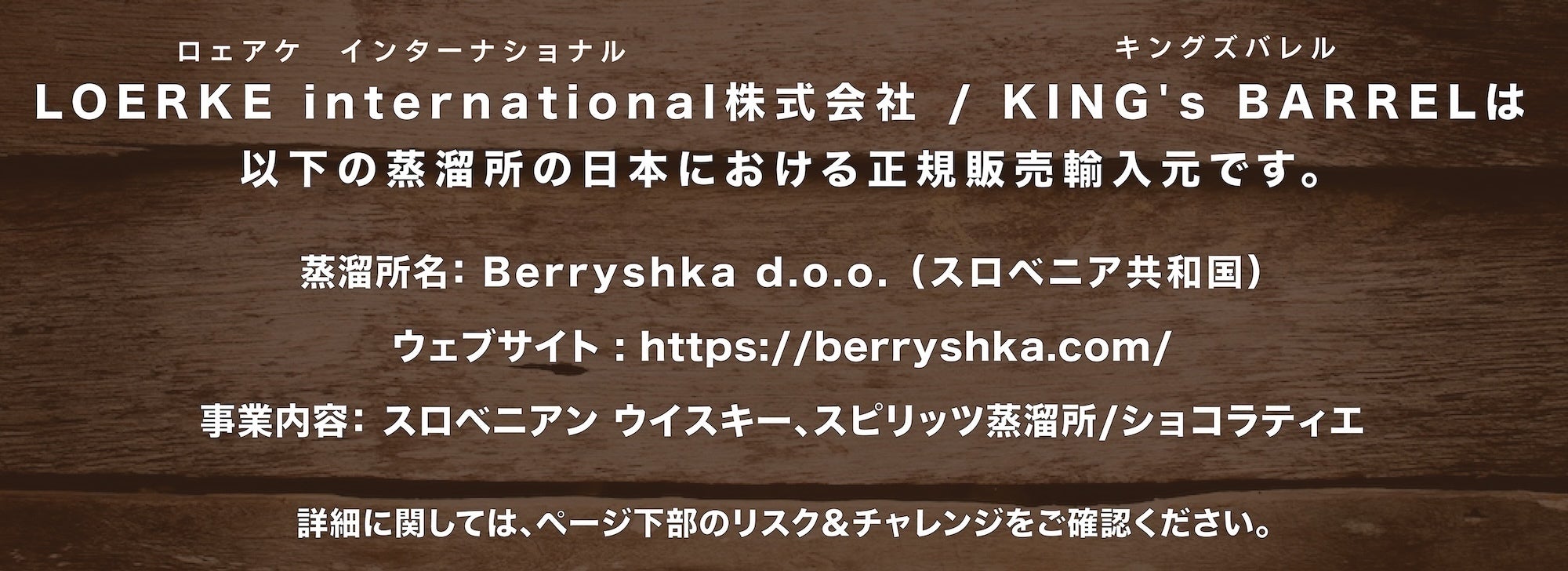 ドイツと北欧のウイスキーとスピリッツの美味しさと各蒸溜所が持つ素晴らしい物語に惚れ込んで、日本ではまだ知られていないハイクオリティで美味しいお酒を取扱うLOERKE international株式会社は、KING's BARREL(キングズバレル)という名前で、未知の美味しいお酒が待つ世界への扉として、日本に住むすべての皆さんと一緒に、その扉を開いて美味しいお酒を探求する旅に出かけようというコンセプトのもと、独自に選び抜いた自らが美味しいと思ったお酒のみを各蒸溜所/メーカーより直輸入し、日本輸入元として蒸溜所と二人三脚で国内での卸と小売を行ってきました。