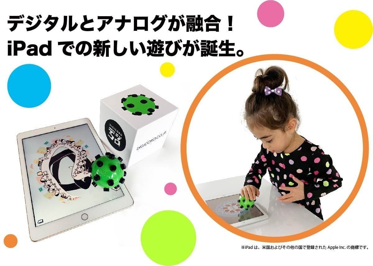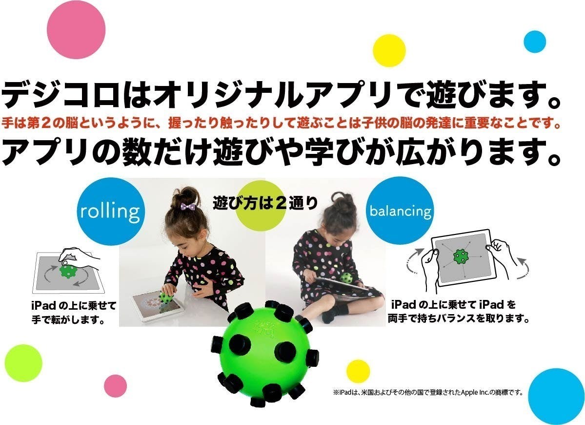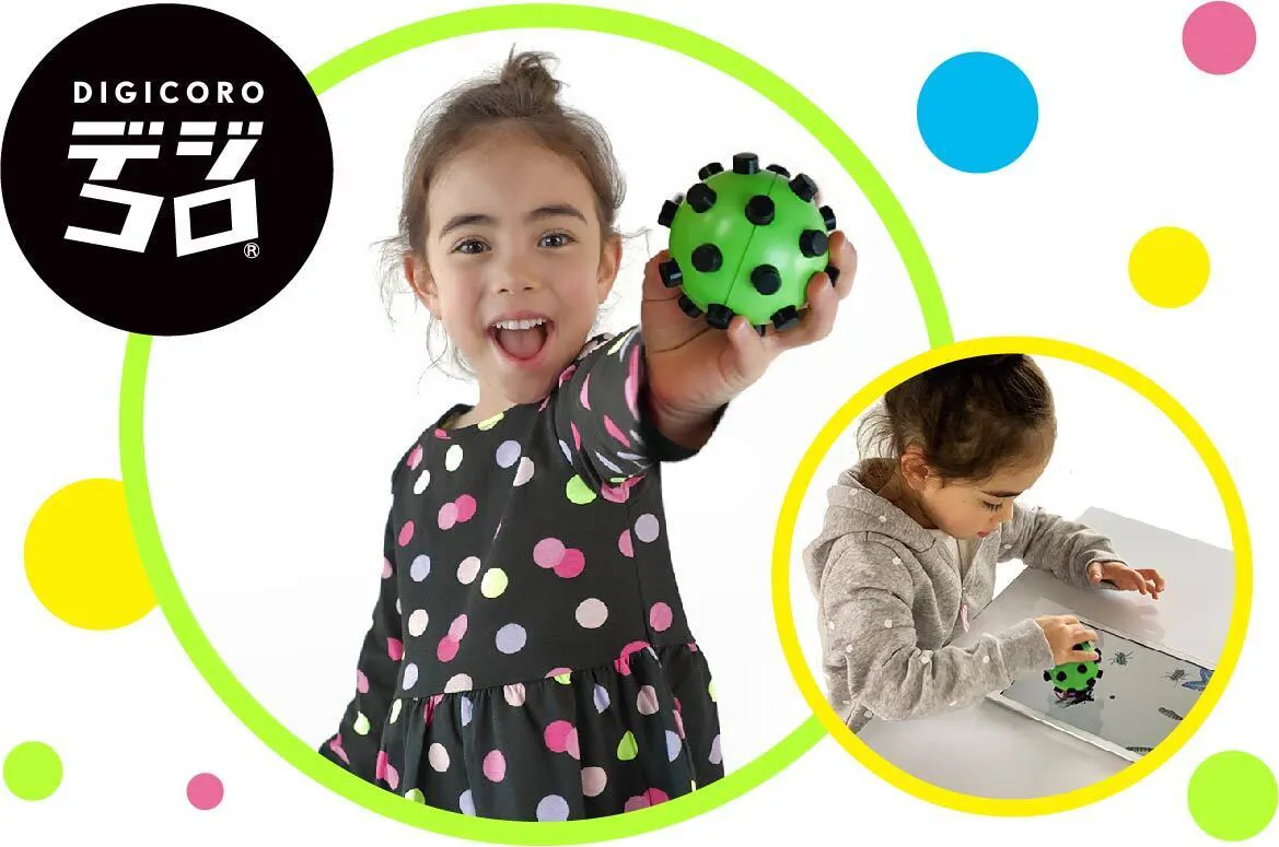 デジコロは子供達がその手で握ってiPad(※)の上でコロコロと転がしながら遊ぶ今までに無い知育玩具です。