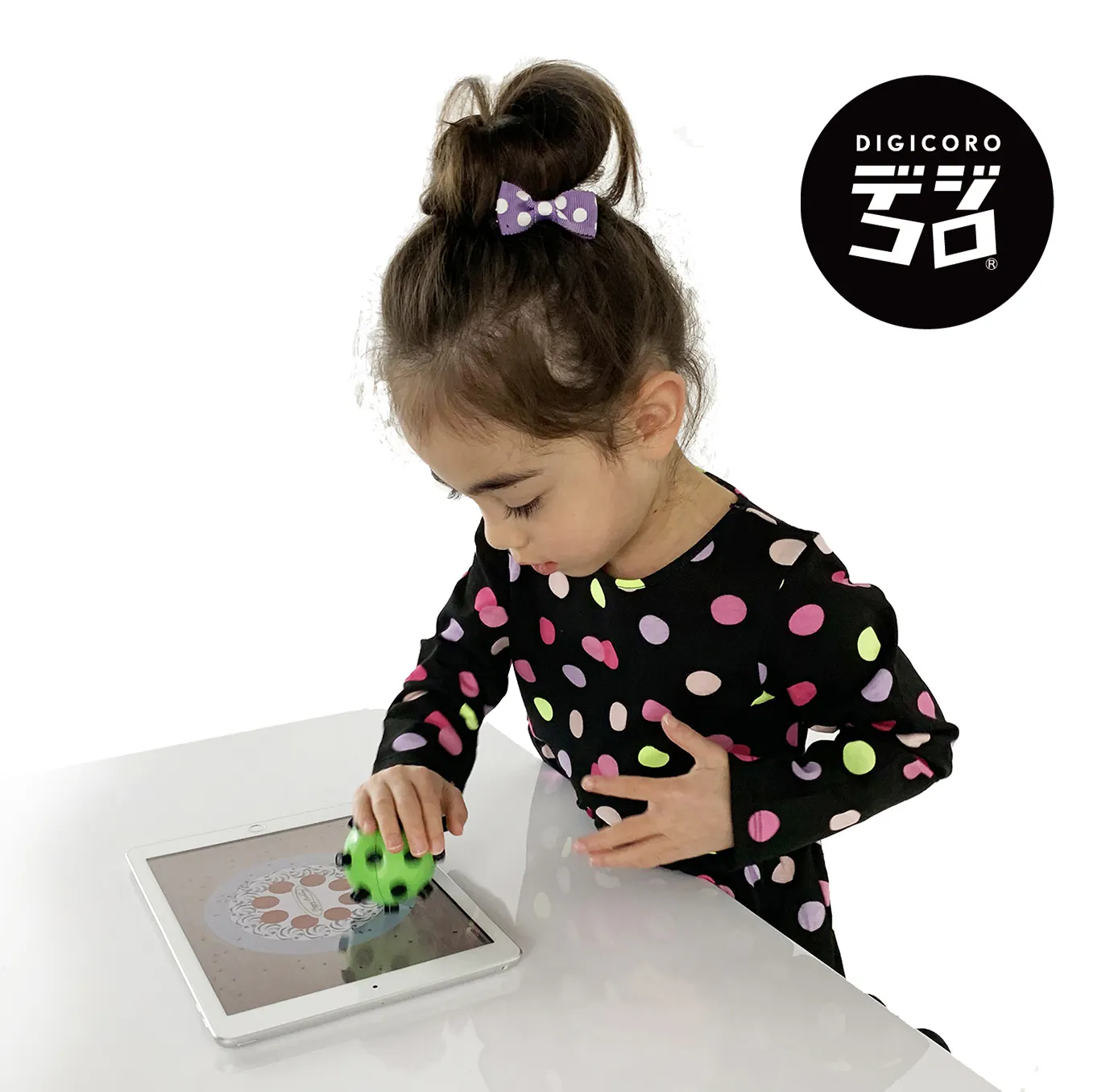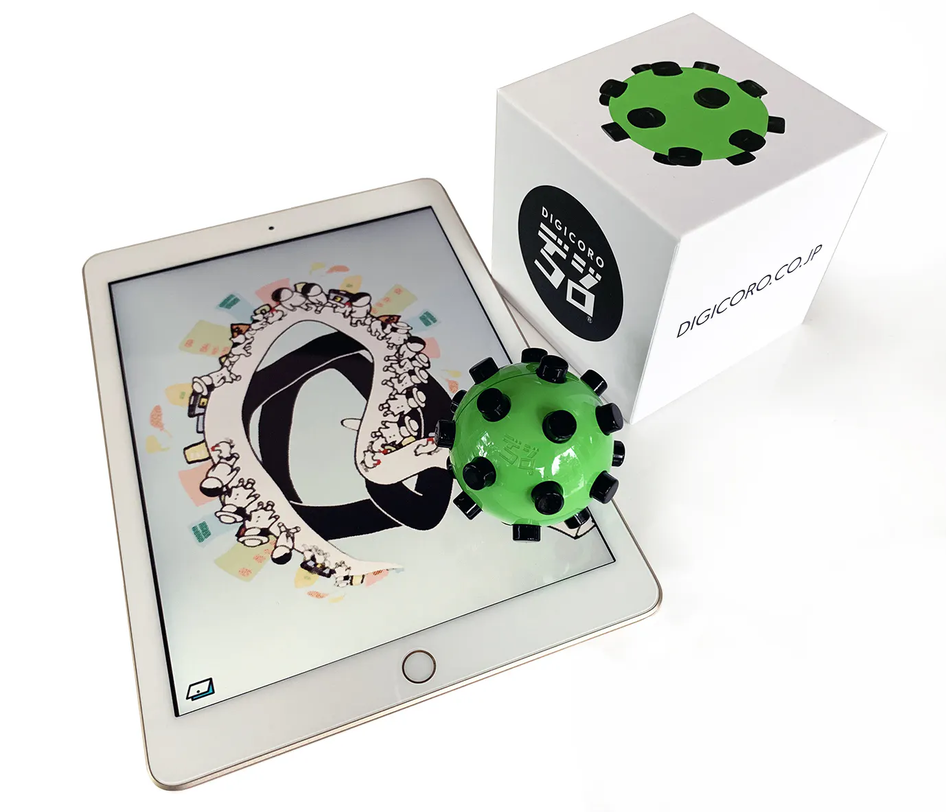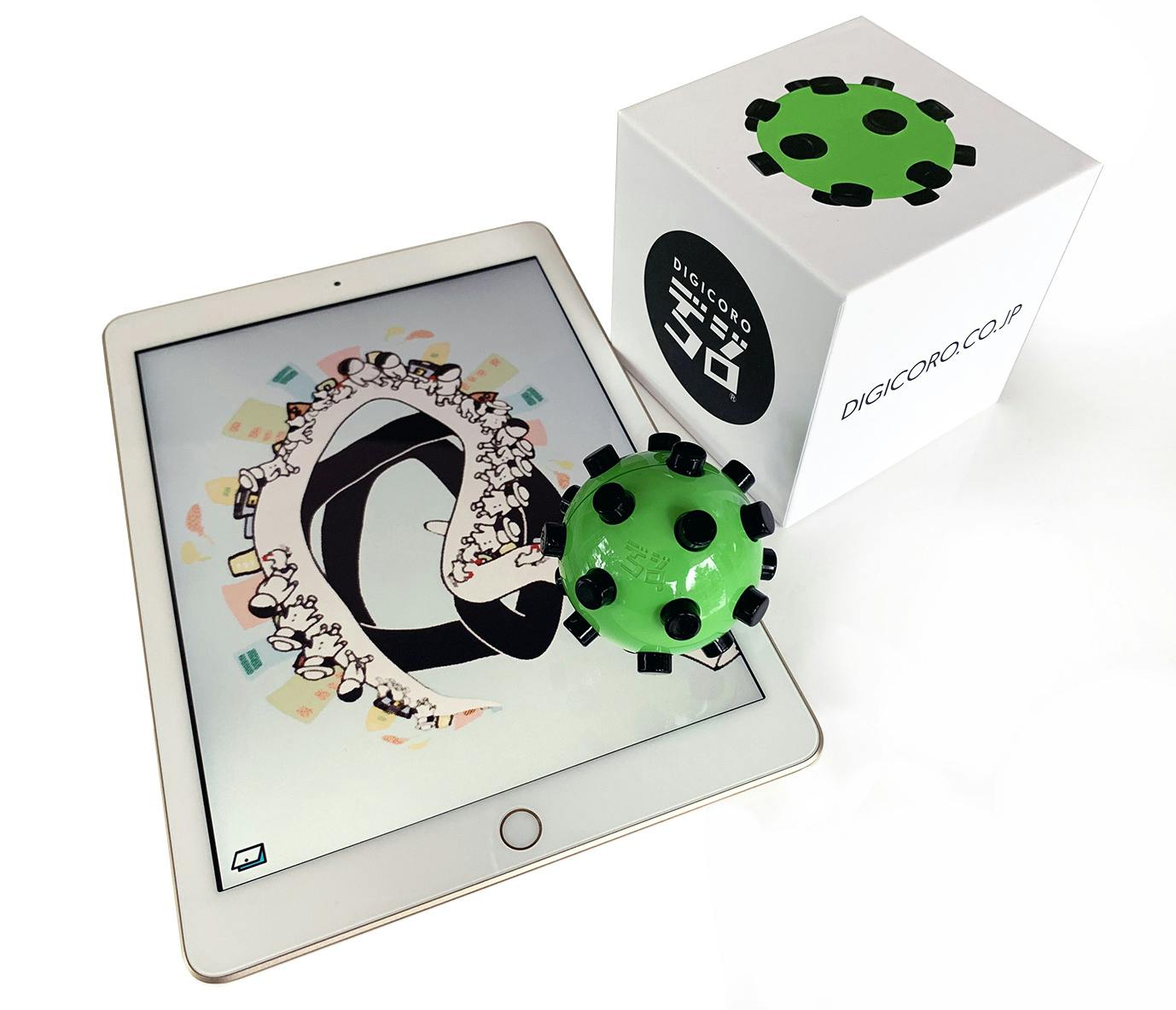 デジコロは子供達がその手で握ってiPad(※)の上でコロコロと転がしながら遊ぶ今までに無い知育玩具です。