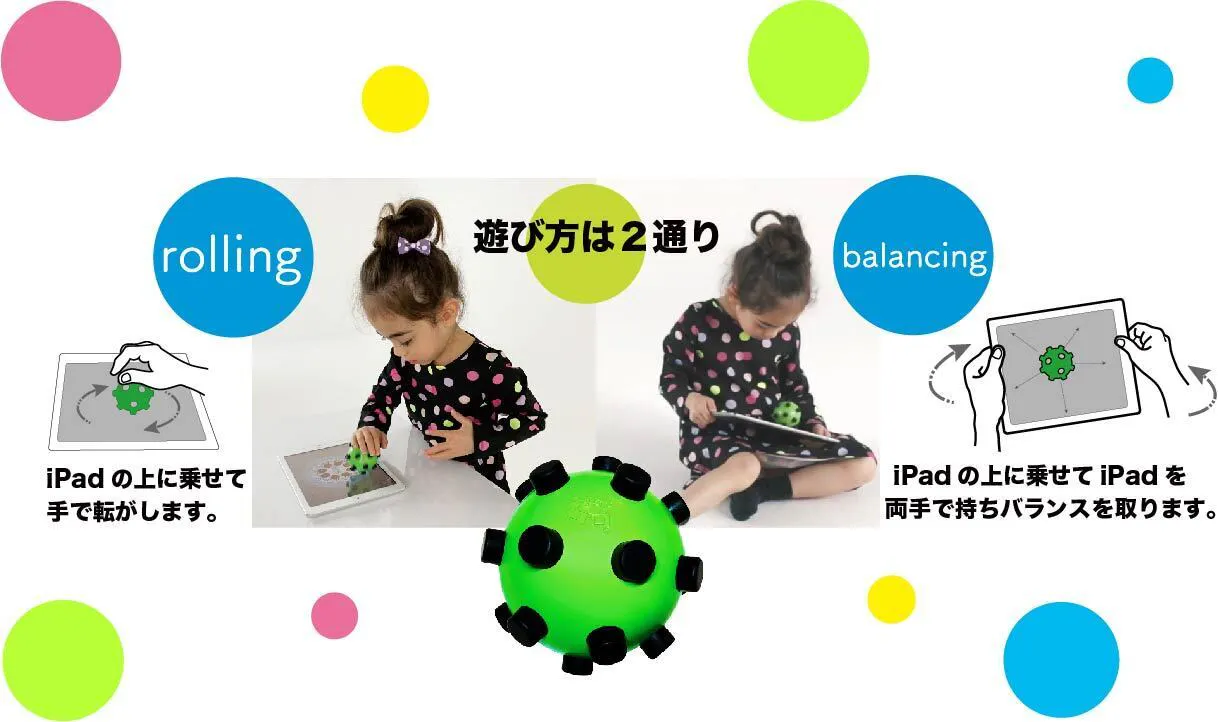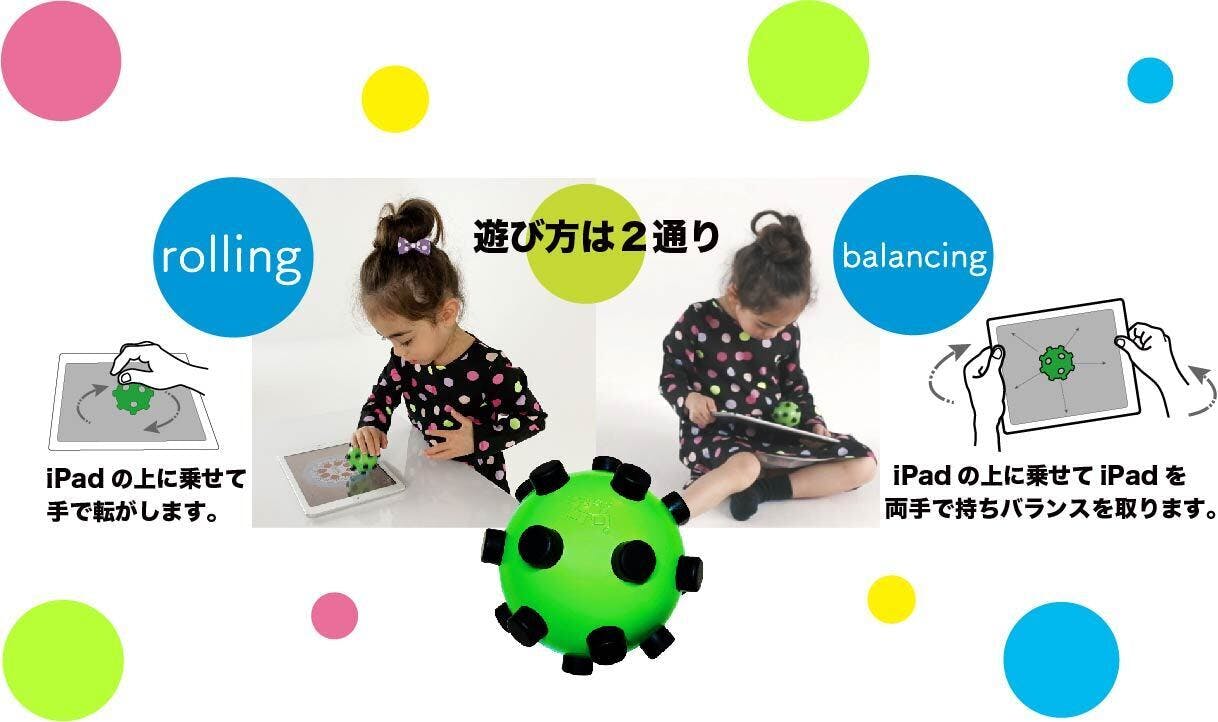 握って転がすことと、iPad(※)を両手で持って画面の上で転がしてバランスを取って遊びます。