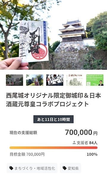 2024/12/28 08:30あらためて達成の御礼みなさまのおかげで、クラウドファンディングもいよいよ佳境を迎えております。これまでにたくさんのご支援と温かいメッセージをいただき、本当にありがとうございます。無事にお城EXPOで西尾城の旗をたて、御城印と共に「西尾」をPRしてまいりました。実は帰ってきてから、人知れずインフルエンザにかかっておりましたが、何とか回復し、残り4日ではありますが、次のステップに進ませていただきます!ネクストゴール八十八にこめた想いプロジェクトにさらなる夢を託し、ネクストゴールを 88万円 に設定することにいたしました!「88」という数字は、「末広がり」という縁起の良い意味があるため、年末に終わる本プロジェクトが無事に「88」を越えて、ご支援いただいた皆様の新たな年が、さらに末広がりで良い年になることを願って、つけさせていただきました!(もし、万が一達成しなくとも、既にラッキーセブンの70万円にご協力いただきました皆様のご多幸が消え去るなんて事は決してありえません!)そして、さりげなく特産品である西尾の抹茶にちなんだ行事「八十八夜」にも関連づけています笑 達成時のリターンについてネクストゴールを達成した際には、ご支援いただいた皆様に「西尾鶴城鶴城六万石と大給松平家」をテーマにした解説書をお付けいたします。今回のクラウドファンディングを共に進めてくれた同級生の近藤君と一緒に展開する「歴史体験さんしゅうや」では、地元の郷土史(史実<ロマンなフィクションも含む)とかけた武将印も制作しており、解説文とセットで提供しております。今回の西尾鶴城六万石の御城印についても、印は六万石の石高を誇った歴代藩主・大給松平家のみにするなど、こだわって制作しているのですが、お城EXPOに行った際に「これ話さないと伝わらないね笑」と気づき、「いつもの解説文がいる!」ということになりました。いざ八十八万円達成にむけて!ということで、めでたい「八十八」をネクストゴールまで到達したおりには、ささやかながら感謝の気持ちを込め、「西尾鶴城鶴城六万石と大給松平家」の解説書を同梱いたします。(既にお城EXPOで御城印をお渡し済の方にも郵送でお届けいたしますので、ご安心ください。)残りわずかな時間ではありますが、ぜひ引き続きの応援・ご支援をよろしくお願いいたします! もっと見る