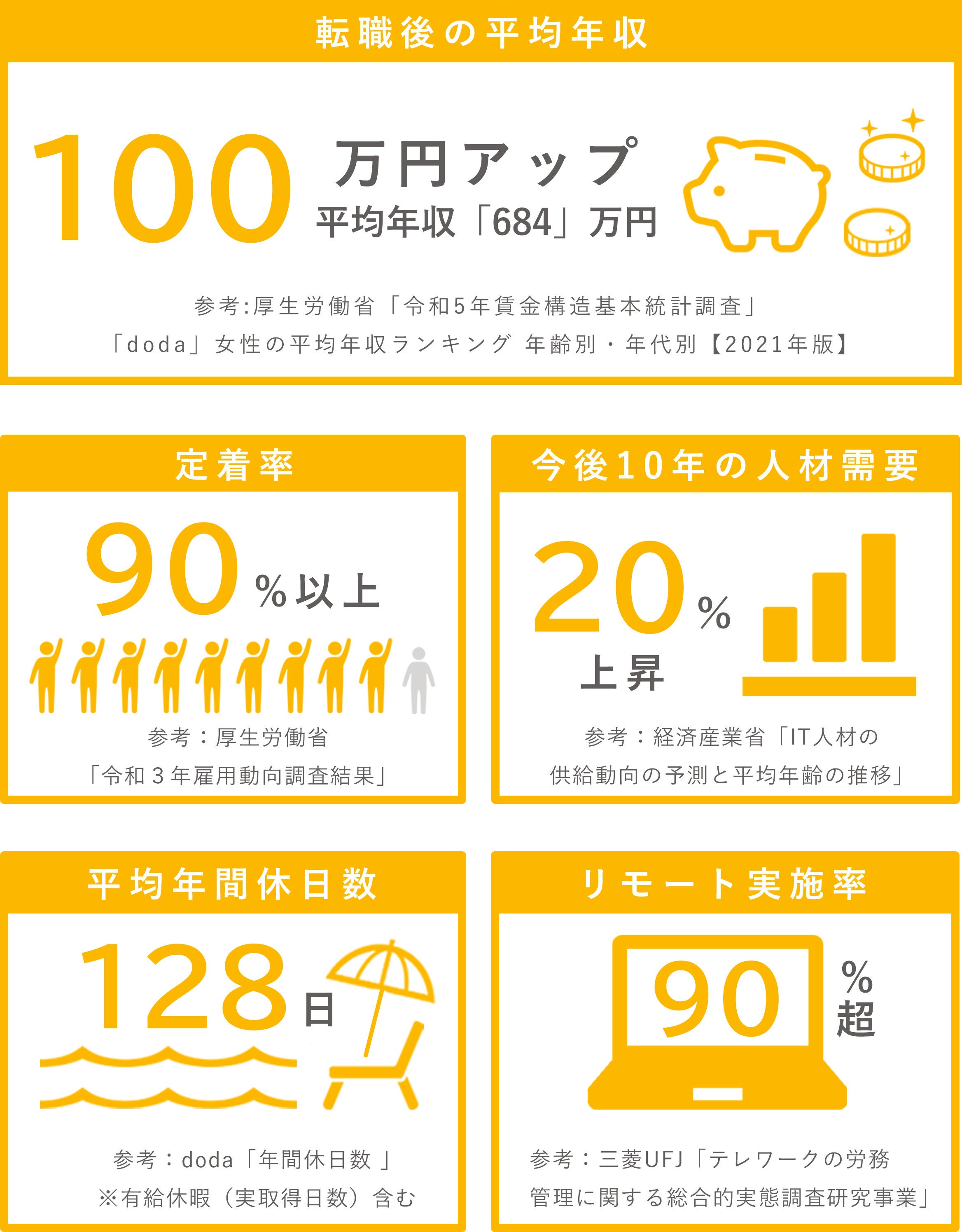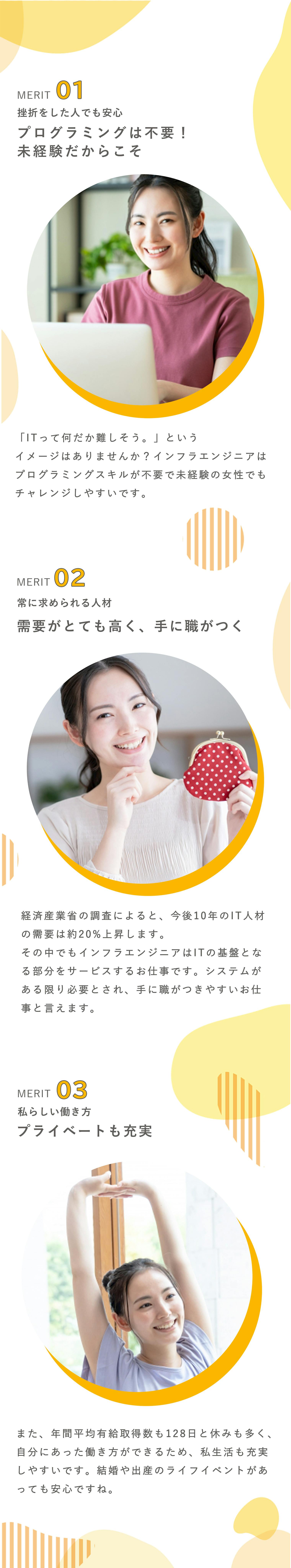 IT業界は男女の収入格差がほとんどなく、女性が活躍しやすい環境が整っていて、今後も求められる将来性の高い仕事です。 だからこそ安心してキャリアを築ける場所を提供したいと思っています。