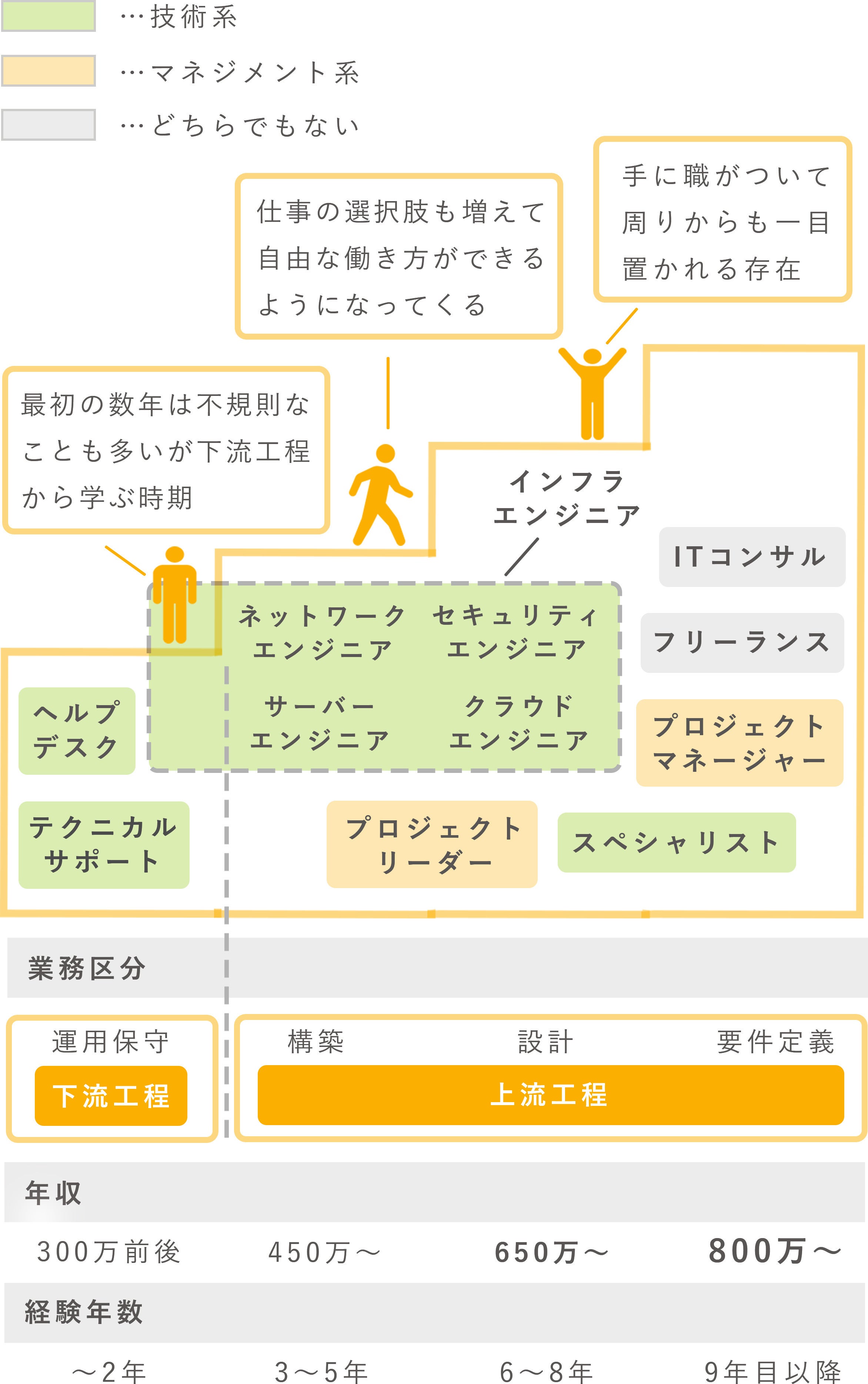 インフラエンジニアは図のように、さまざまな業種や業務区分が存在します。