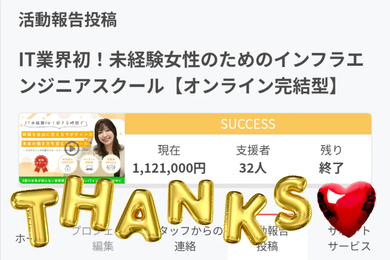 ビジネス部門で100万以上の資金調達の成功確率は5%以下とも言われる挑戦を、こうして形にできたのは、応援してくださった皆さま一人ひとりのお力添えのおかげです。