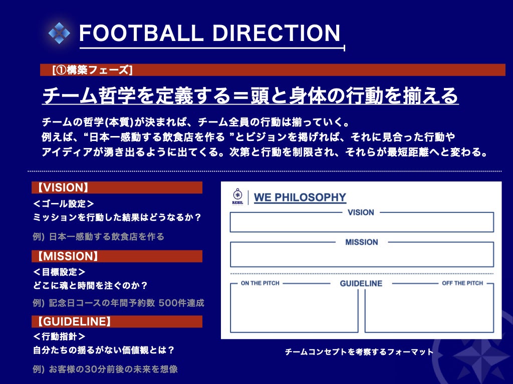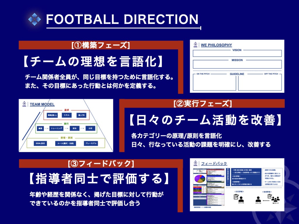 "①言語化した理想"をもとに、指導者たちの言動はどうだったか?そもそもトレーニングへの準備はどうだったのか?日々、実行と反省を行う。チームのために意見を言い合える組織が価値あるものを生み出す環境であると、信じています。