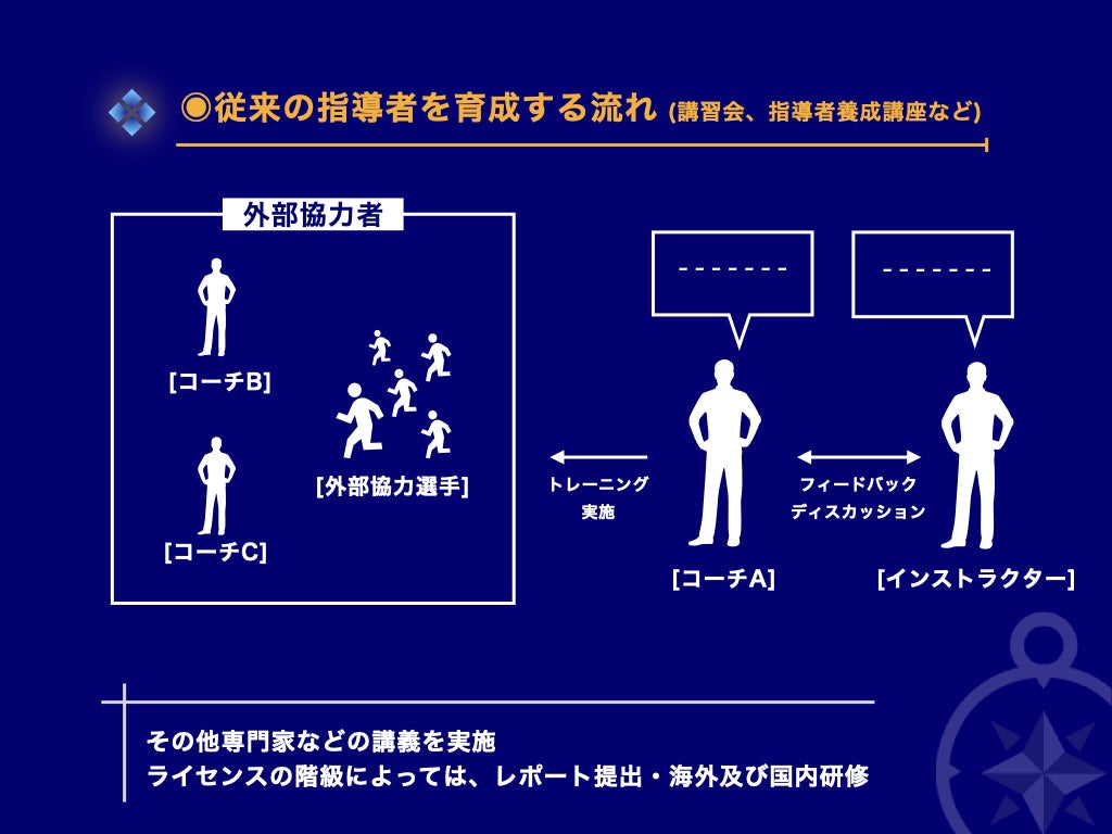 上記、添付資料のようにライセンスの資格を取るために受講したコーチたちが集まり、長い期間をかけて指導者養成講座は行われていきます。