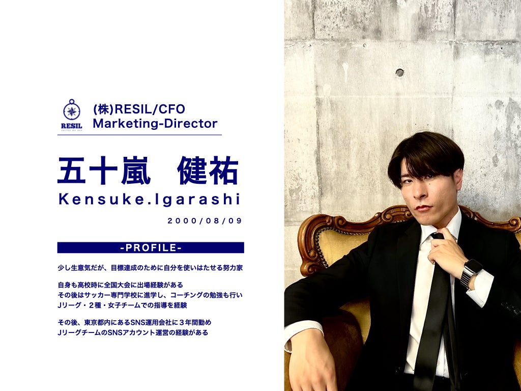 2024/12/23 16:08皆様の多大なるご協力のおかげで、この度、株式会社RESILに新メンバーが加わりました!<新メンバー紹介>株式会社RESIL CFOマーケティングディレクター五十嵐 健祐 l Kensuke.Igarash<プロフィール>【選手歴】・2013年〜2016年 AMBICIONE松本・2016年〜2019年 松本国際高等学校(2016年高校サッカー選手権ベスト16・2018年高校総合体育大会インターハイ出場)【指導歴】・2019年〜2021年 JAPANサッカーカレッジ サッカーコーチ研究科 ※学生・2020年 アルビレックス新潟トップチーム分析コーチ・2021年〜2023年 松本国際女子高等学校ヘッドコーチ-その後、他業界への転職を行う。・2023年 都内のSNS運用会社に入社・2024年 株主である本社転籍 人事部・新規事業立ち上げを経験SNS運用・Webマーケティング、人材育成、事業立ち上げなど数々の経験を経て今回クラウドファンディング達成時に参画<コメント>私は、代表の恵木とは専門時代の先輩後輩の関係で、出会った当初から彼のサッカーに対する熱い情熱や想いはずっと感じていました。サッカー業界に選手、指導者として育成年代からプロまで20年近く関わってきて、多くの課題をサッカー業界の経験を経て痛感しておりました。私が女子の高校サッカーを指導させてもらった時に、"指導者の質をさらに向上をさせなければならないこと"や"女子サッカー界の指導者が不足している"という明確な課題に直面しました。そんなサッカー業界が抱えている課題を解決できそうな事業プランと熱意を恵木からプレゼンしてもらい、共感を得たので株式会社RESILへの参画を決意しました。私自身は主にマーケティングとファイナンスの部分で"RESIL"を大きくしていきます。代表の恵木とまずは2人で業界を変えれるように尽力して参ります。五十嵐 健祐 もっと見る