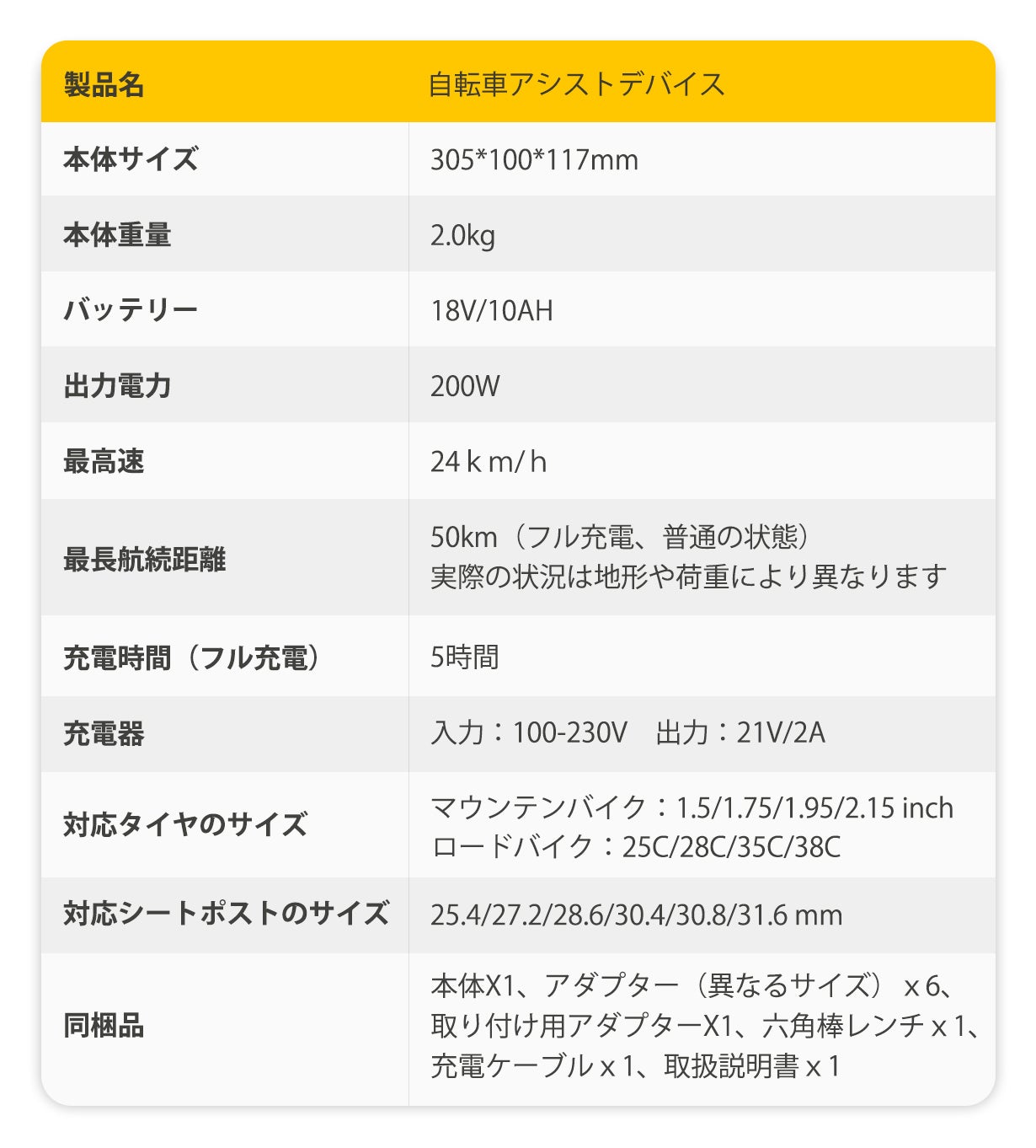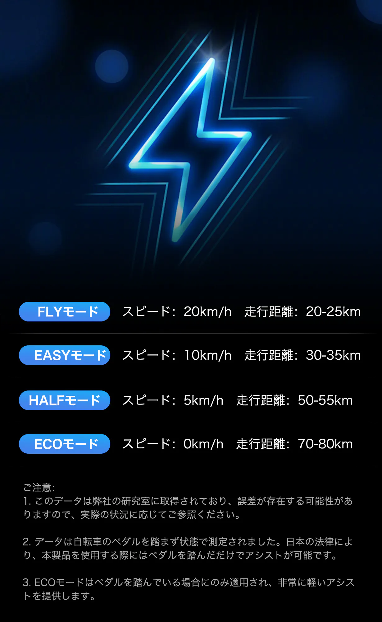 このデバイスは内蔵バッテリーがあり、フル充電で最大50kmの走行距離をサポートします(HALFモード)。充電時間がわずか5時間で、より迅速なサイクリング体験を提供できます。