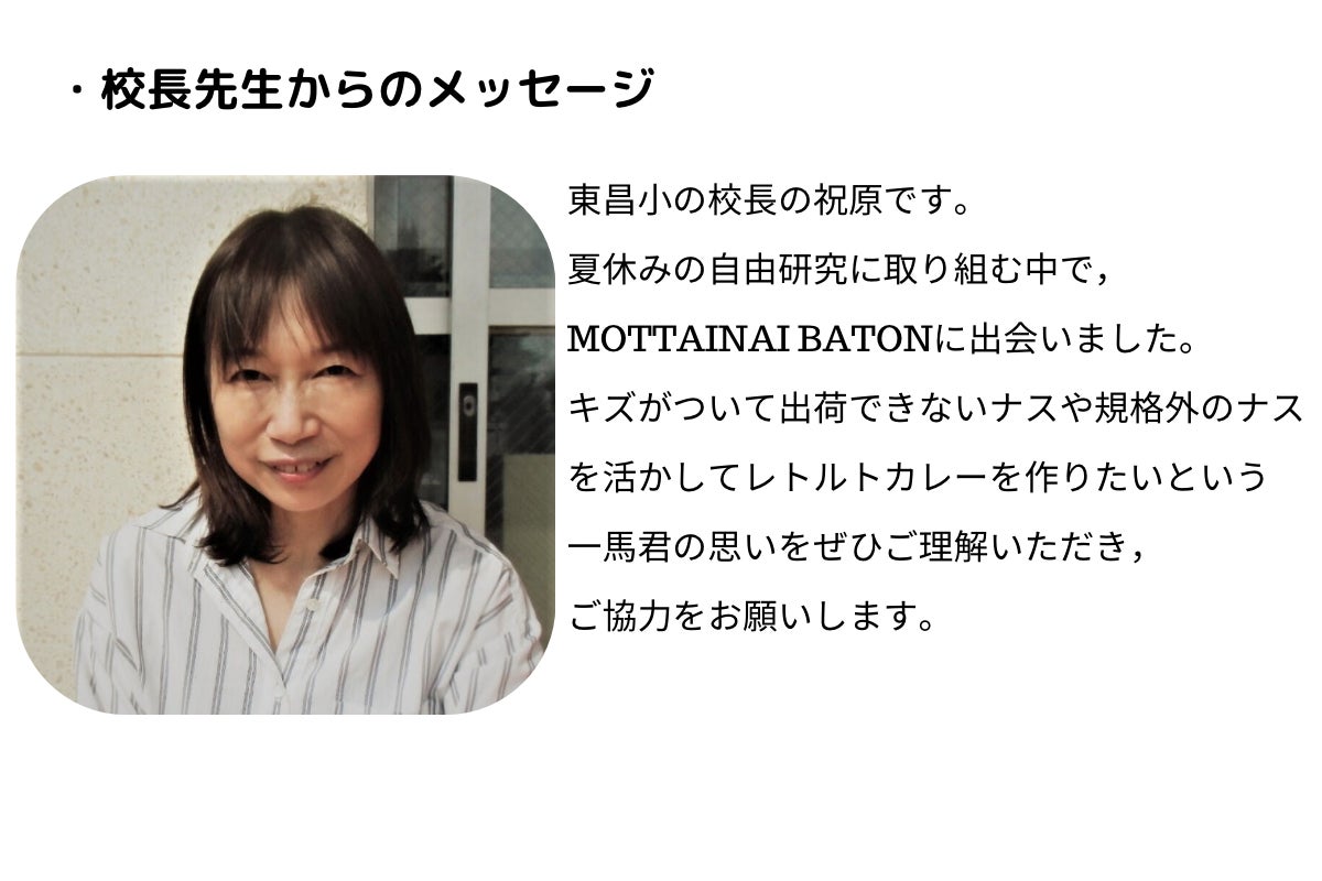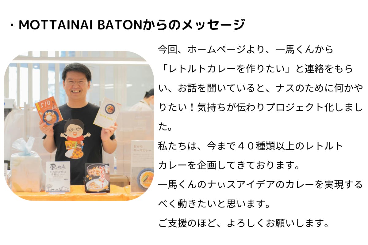 そこで、ナスを使って何かできないかと考え、カレーにすることを思いつき、モッタイバイバトンのホームページを見つけて、「ナぃスなカレー」のプロジェクトが始まりました。