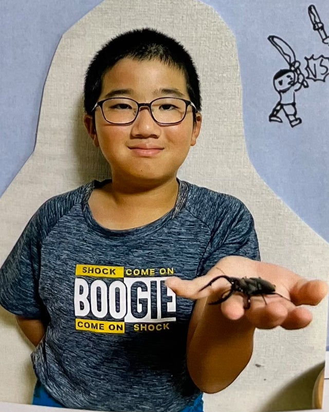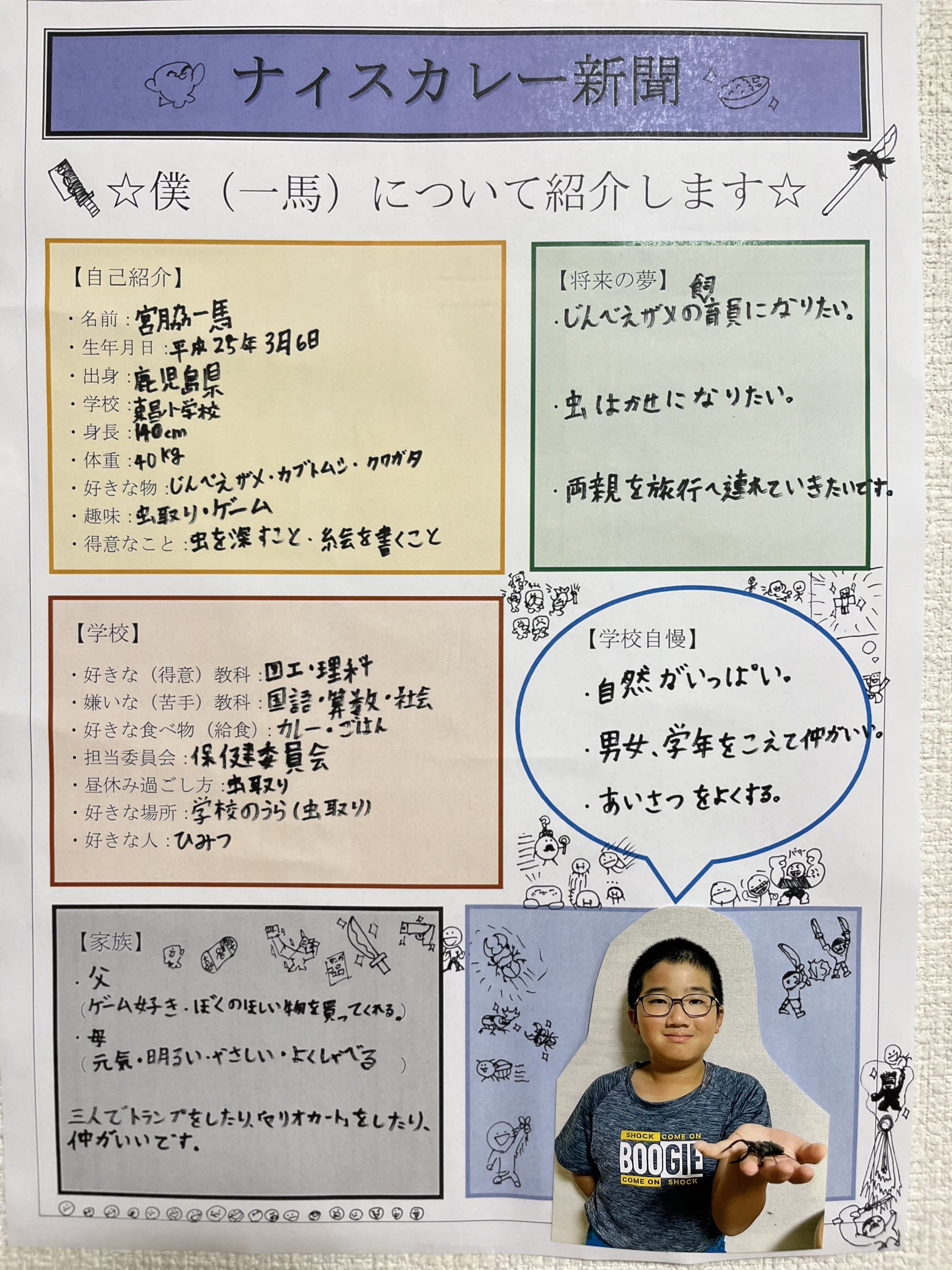 好きなものは「じんべえザメ」「カブトムシ」「クワガタ」で、趣味は虫取りやゲームをすることです。特技は、虫を探すことや、絵を描くことです。好きな食べ物は「カレー」と「おにぎり」です。
