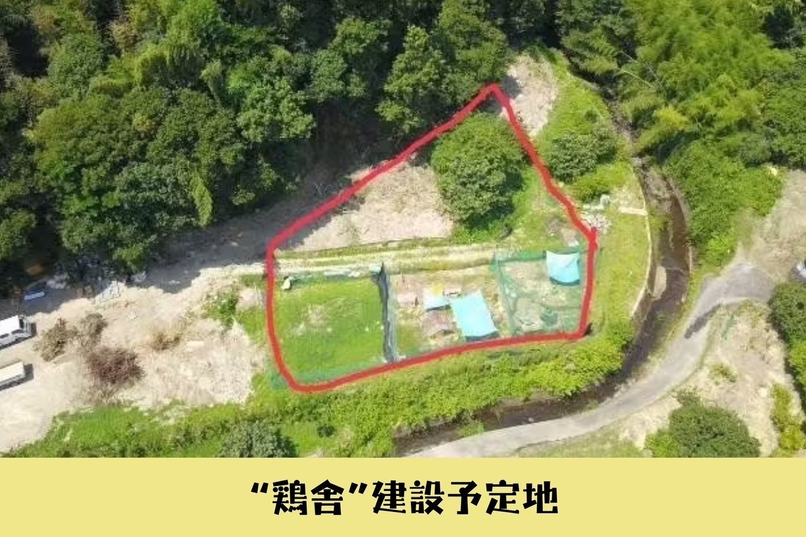 現在計画している「平飼いBASE」の全体の広さ(赤い線で囲んでいる範囲)は650m²以上で、鶏舎はビニールハウスを使って250m²くらいのスペースを作る予定です。このBASEにはまずは300羽が生活できるように準備します! 鶏舎は産卵場と悪天候時の避難場所も兼ねています。もともと畑地だった場所と雑木林の一部を含んだエリアで風通しもよく、川も近い立地なので、ニワトリたちをかなり自然に近い形で飼育できます! 場所は大分市の賀来にあります。