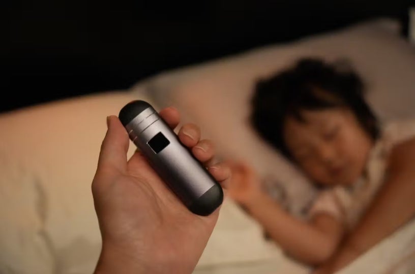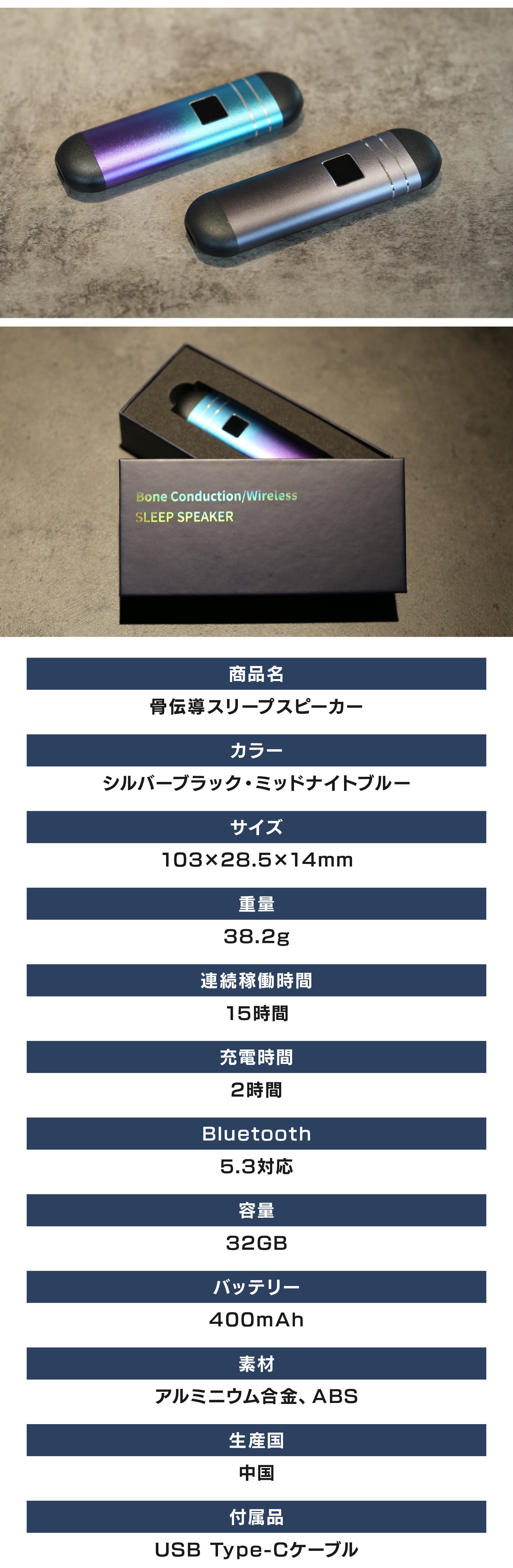 また【骨伝導スリープスピーカー】はスティック状の手のひらサイズ。