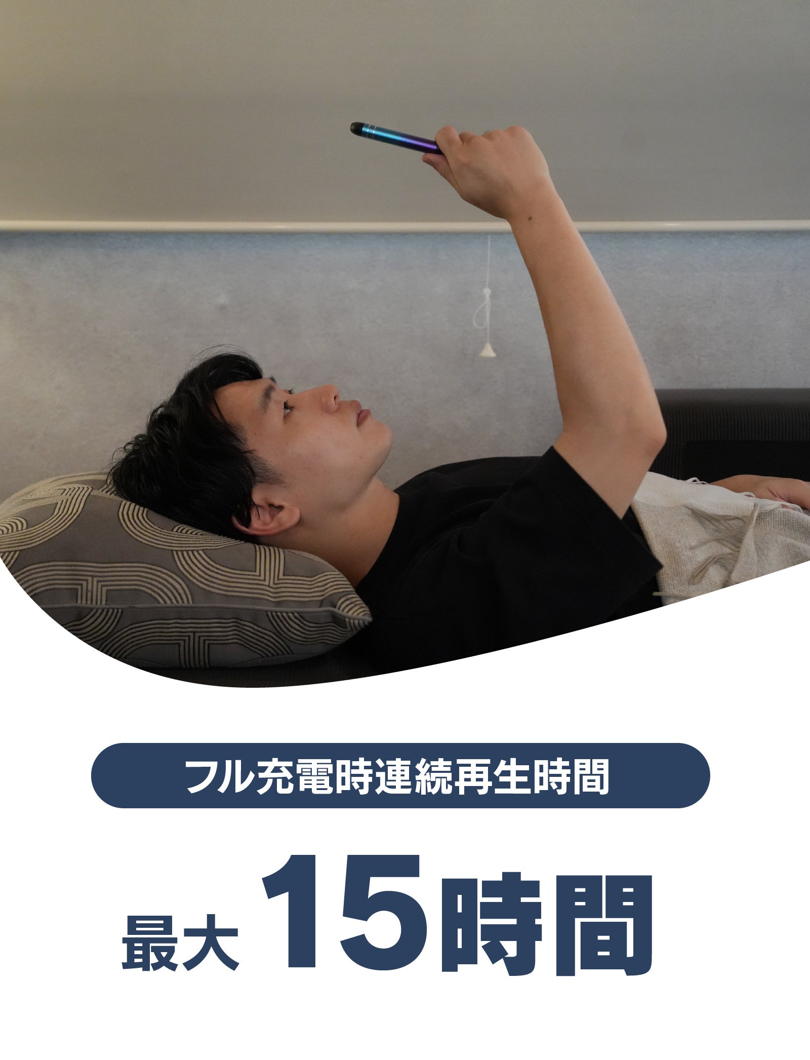 A: フル充電で約15時間の連続再生が可能です。これにより、一晩中音楽を楽しみながら安心して眠ることができます。