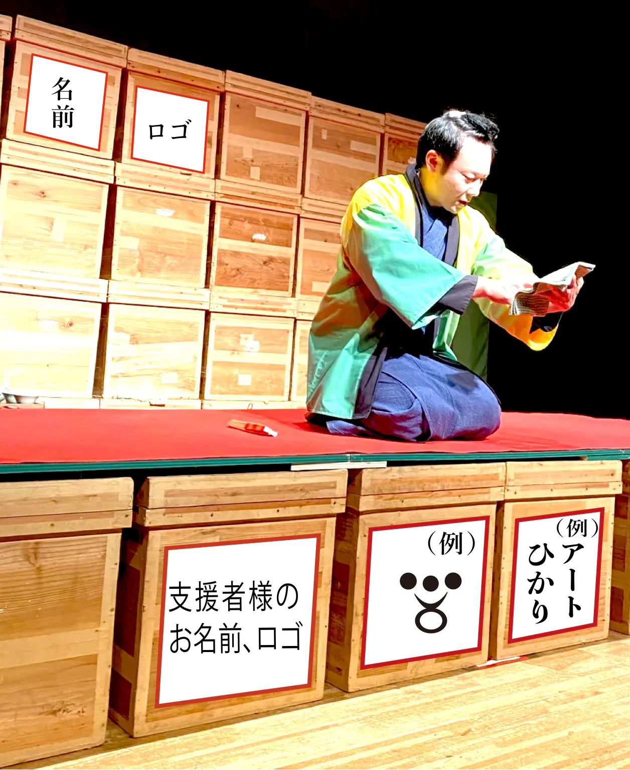 舞台美術に「茶箱」を使用しています。茶葉はこの木製の茶箱に入れられ、船で輸出されていました。そして茶箱には蘭字と呼ばれるラベルが貼られていました。蘭字は商標ラベルであり、絵とお茶の種類や会社名など製品情報がデザインされた版画です。この蘭字ラベルが貼られていた位置(茶箱側面)に、支援者様のお名前もしくはロゴを掲載させていただきます。