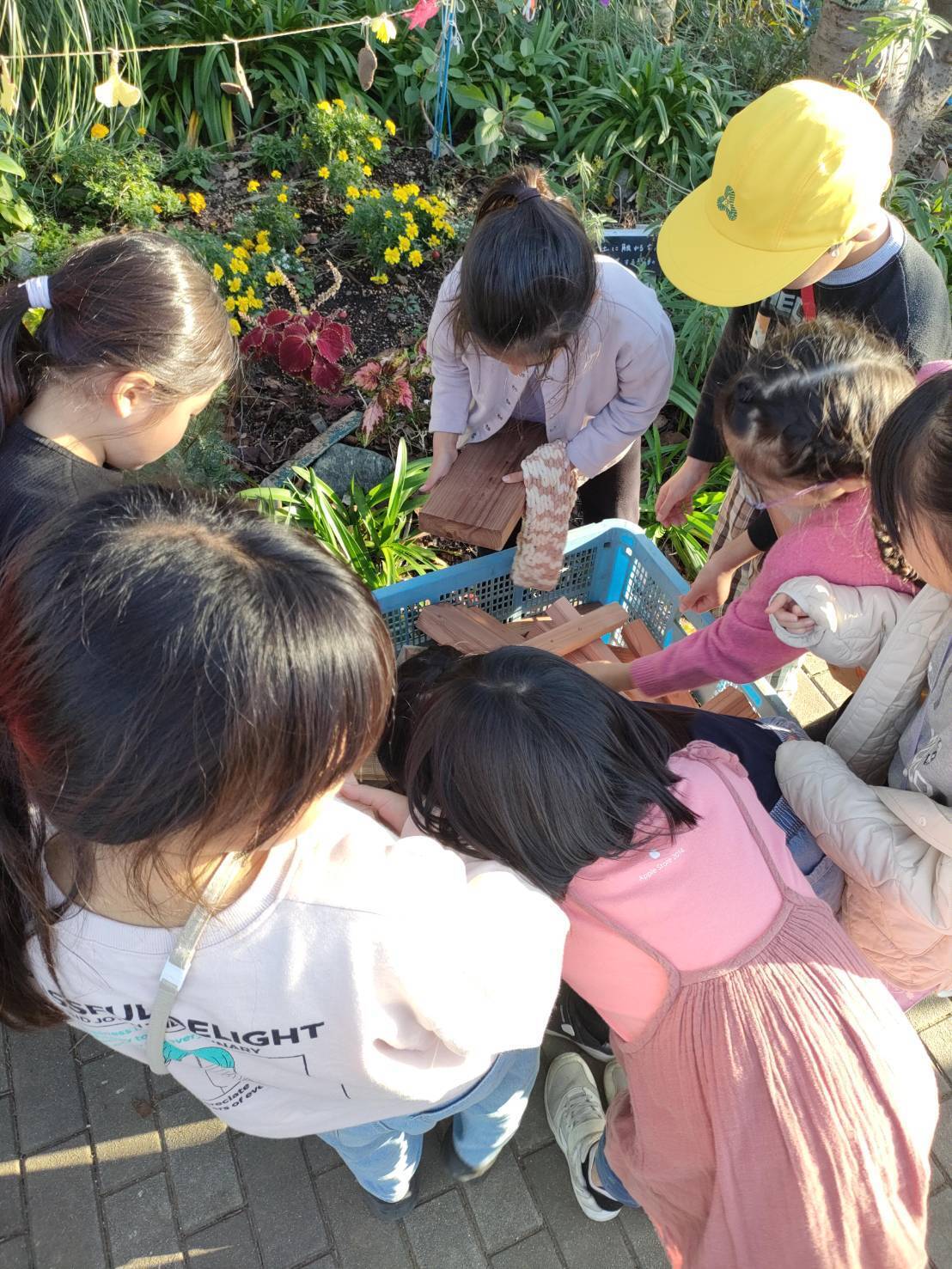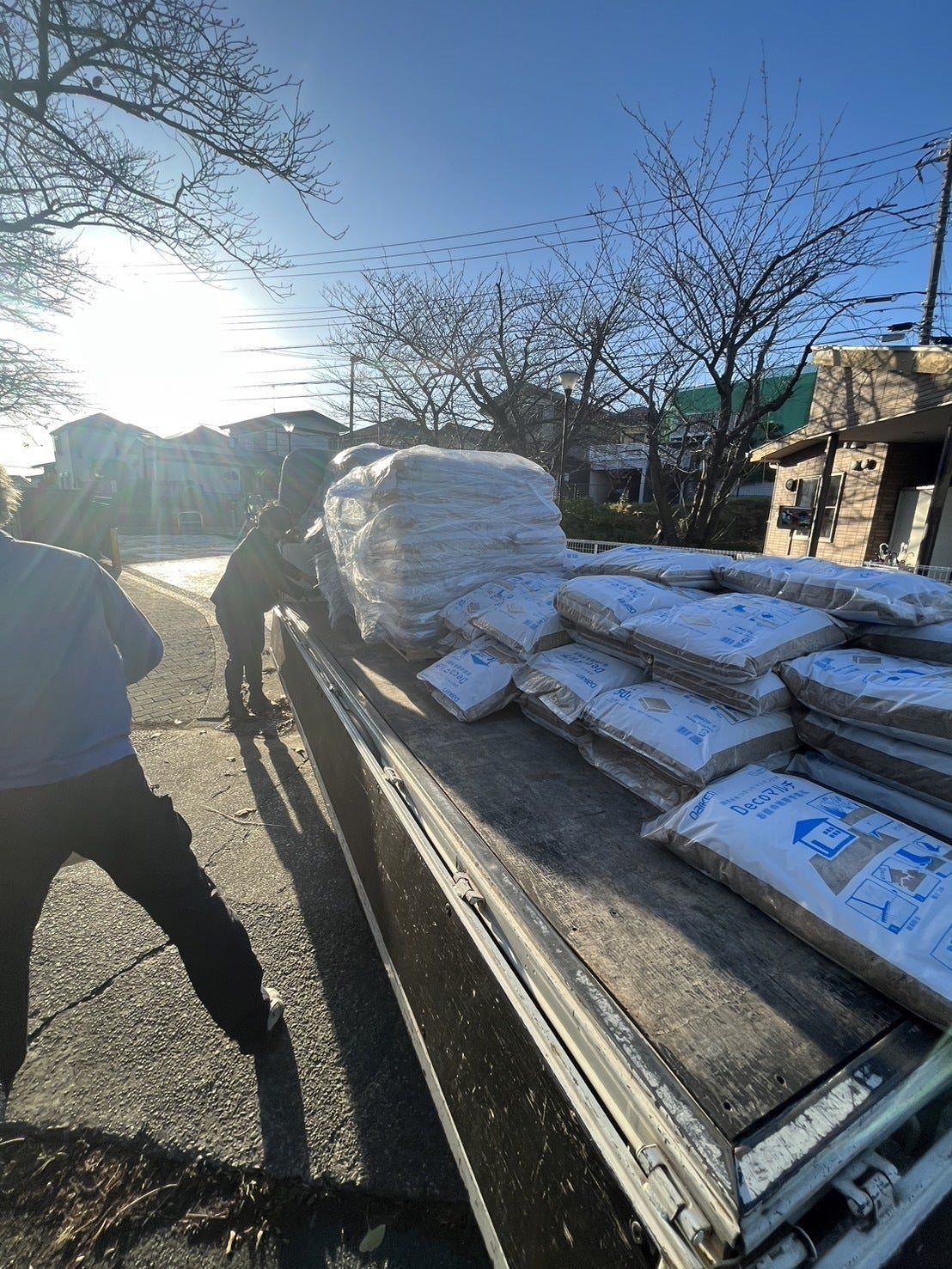 大建工業さんや池サポメンバーなど保護者、先生とみんなで荷下ろし、ツリーハウスの周りに