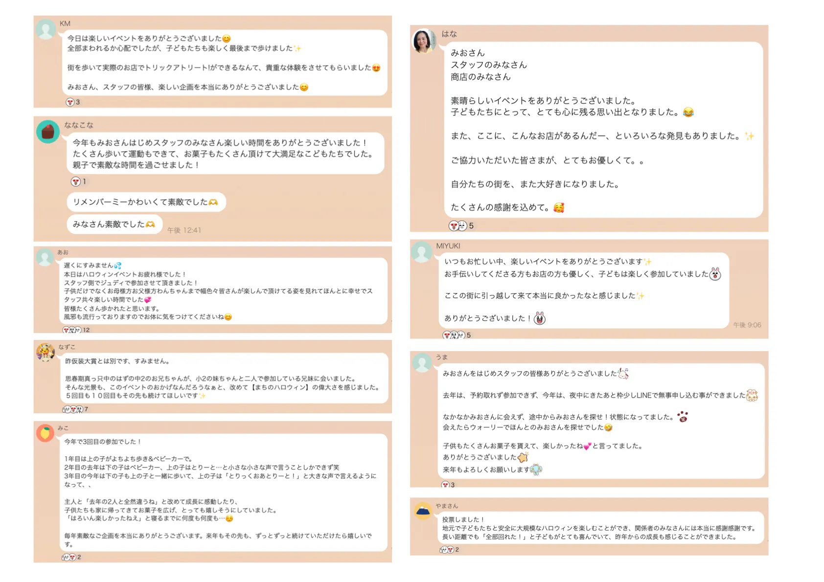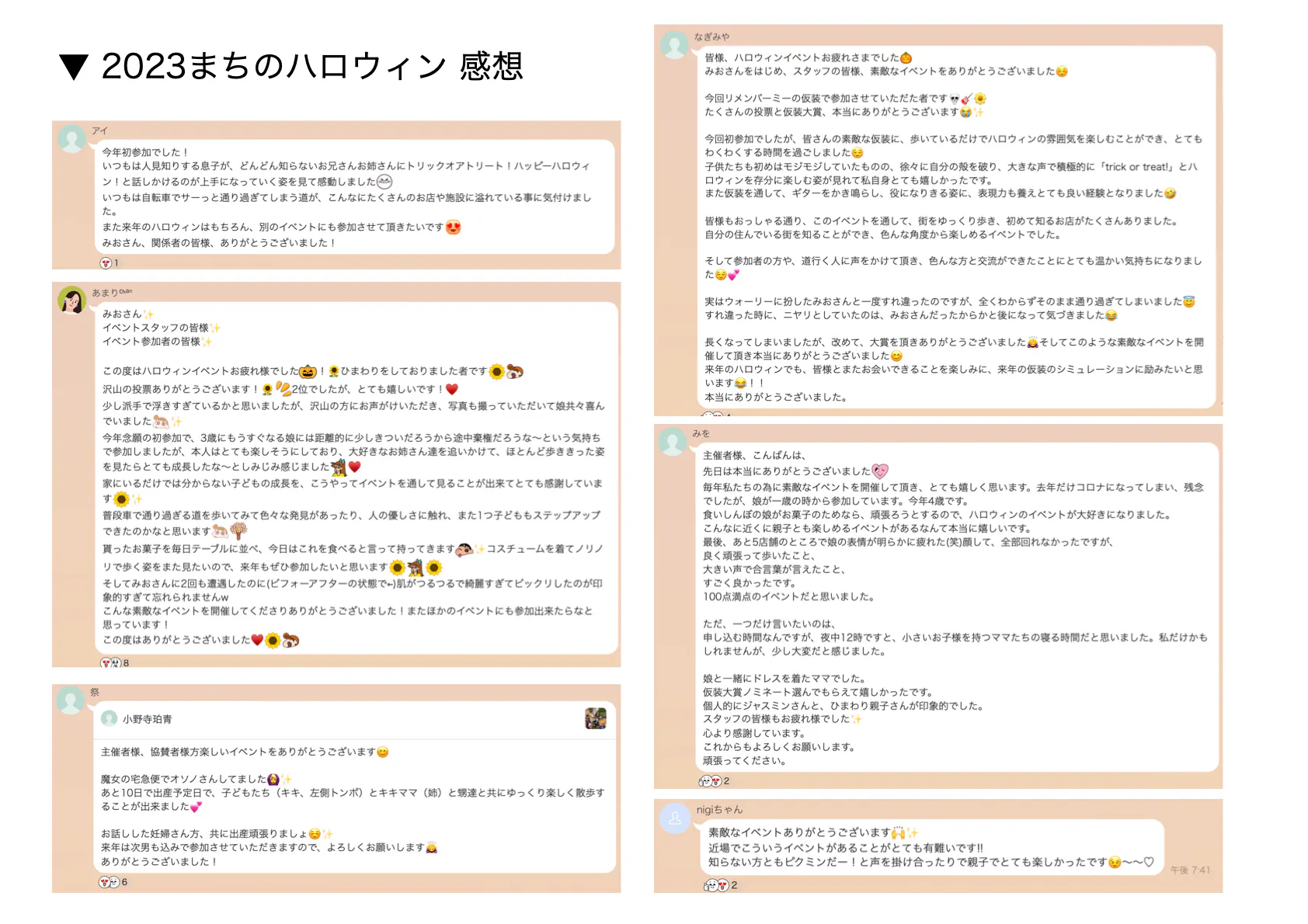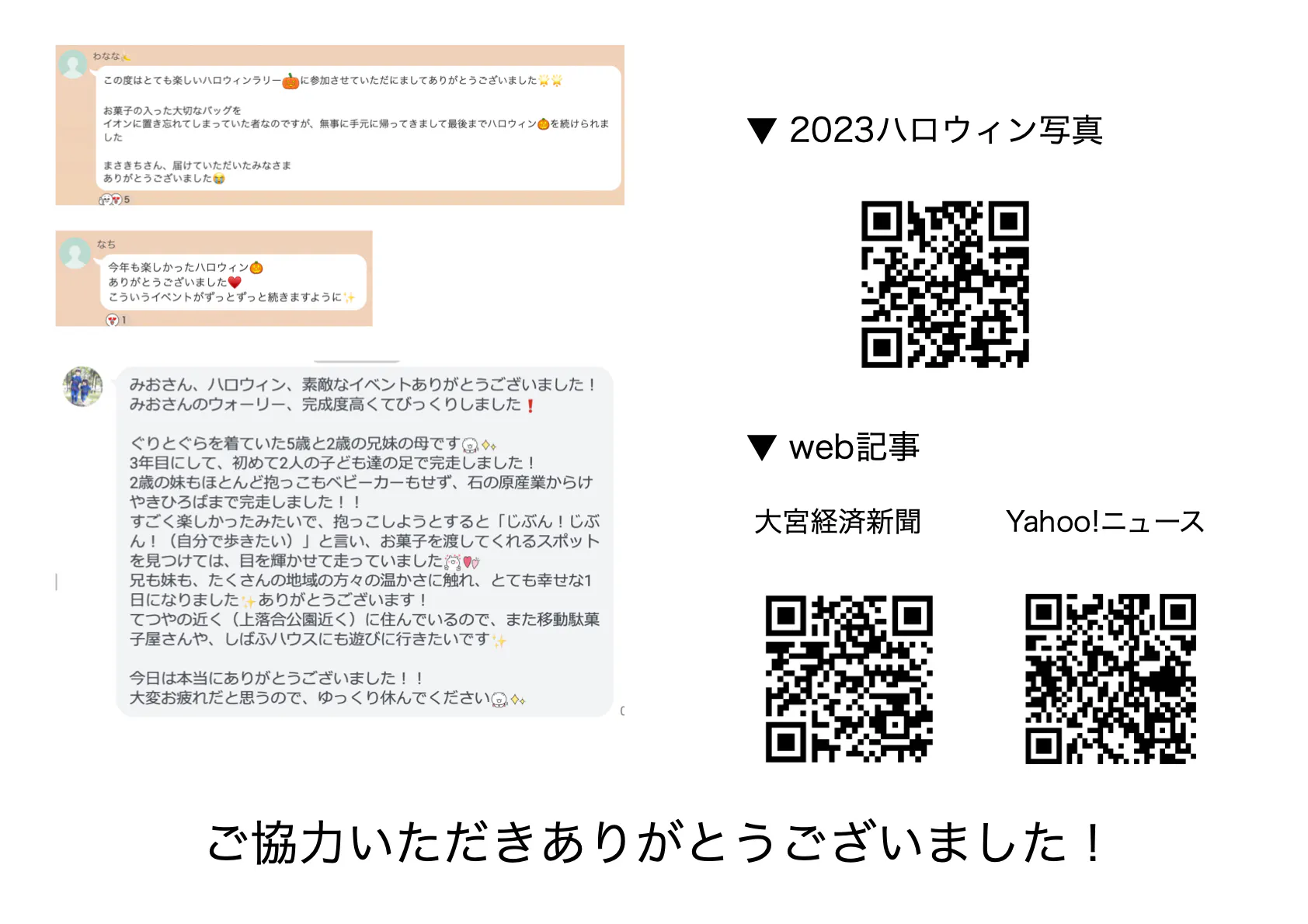 2024/11/24 10:27まちのハロウィン開催から1ヶ月。参加者やスタッフの方よりたくさんの感想をいただいたり、記事にしていただいたり、他の地域の方からお声掛けいただいたりと嬉しいことがたくさんありました。あらためて、こちらでも共有させていただきます。こちらの投稿をもって、最後の報告とさせていただきます。クラウドファンディング、大変なこともありますが、やはり、それ以上に人と人とがつながる素敵な仕組みだと感じております。また、一緒に作り上げていくというイベントを企画していきたいな、と考えております。みなさま、応援いただきありがとうございました!▼記事https://omiya.keizai.biz/headline/1909/▼感想▼当日の写真 もっと見る