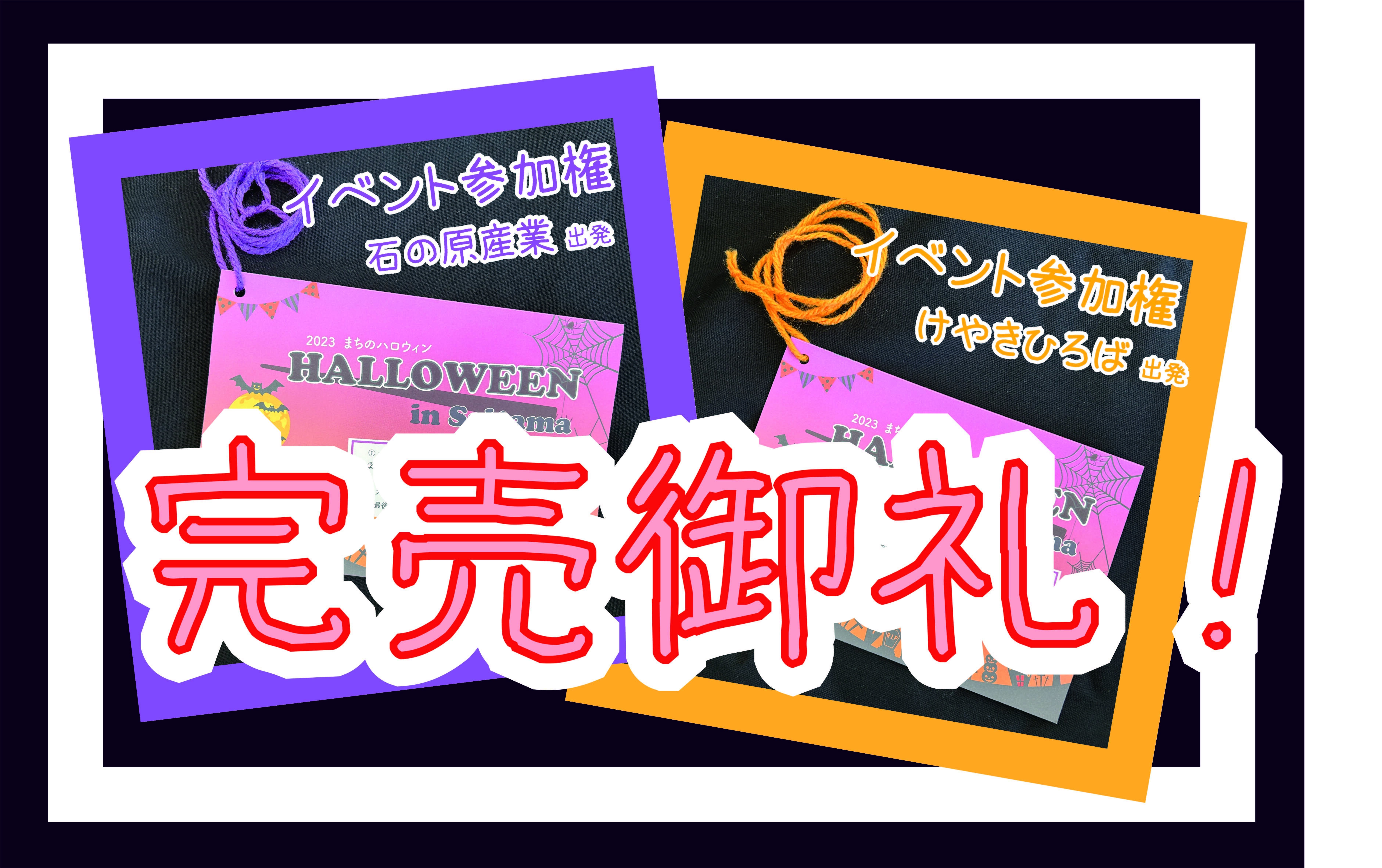 みなさま『まちのハロウィン』に興味を持っていただきありがとうございます。参加権のチケット400枚がすべて完売となりました。購入してくださったみなさま、夜分遅い時間、お疲れのところ時間を割いていただき、本当にありがとうございました。参加する方だけでなく、一緒についてまわるだけでも楽しめるようなイベントになるように努めてまいります。また、チケットを手に入れようとおもったけど、購入できなかったみなさま、本当に申し訳ありません。もっと枠を増やすことができればよいのですが、安全管理やお菓子の購入資金など、今の私にとってこの人数が限界でした。力不足となってしまい申し訳ありません。すこしでも多くの方に楽しんでいただけるようにやり方なども常に考え続けてまいります。お子さまだけではできませんが、お菓子を配るスタッフとして家族で参加するという方法もできますので、なにかありましたらご相談ください。引き続き少しでも多くの笑顔がみれるように精一杯考えながら動いてまいります!