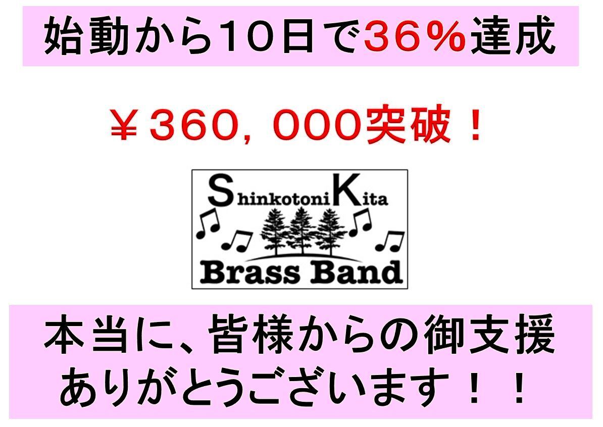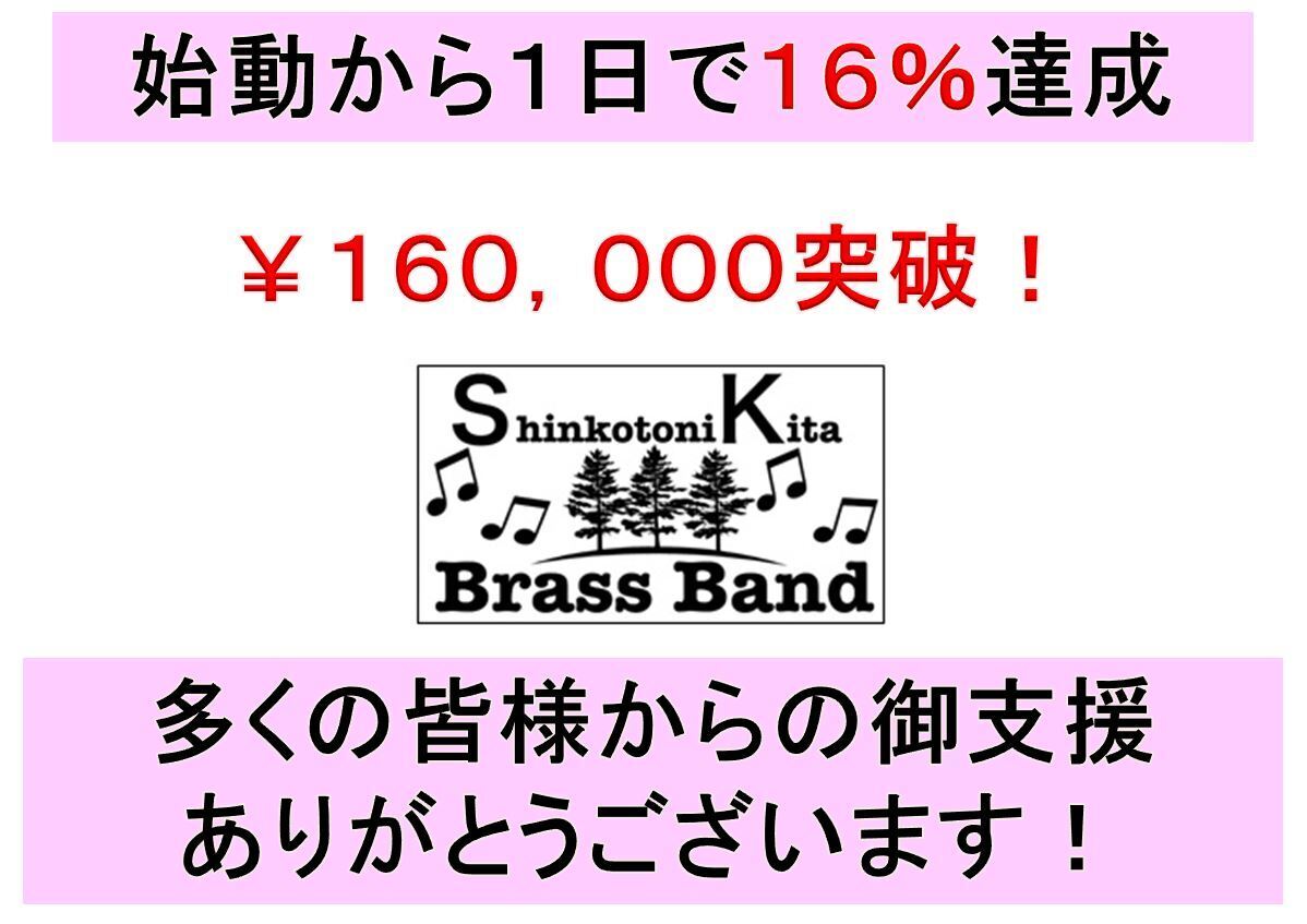 多くの皆様の支援で、昨日9/9(月)19時頃から始まった本プロジェクトですが…たった1日の経過で16%、約¥160,000も達成することができました!本当に、皆様ありがとうございます!!子どもたちには、CFが始まってからの支援額の推移などはまだ知らせておりません。(各家庭でチェックしているところもあるかもしれませんが…)改めてブラスバンドメンバーには…「みんなの東日本での演奏を、多くの大人たちが、それも”見知らぬ大人も”、”大勢が”、お金という形にして支援してくれているんだからね」「大勢の大人たちが応援してくれている、そのことを絶対に忘れないで、頑張っていこうね!」…と、明日の朝練習の時に伝えて参ります。子どもたちも、保護者も、指導者も、とても励みになっています!このまま、練習も精一杯頑張り続けて参ります。どうぞ皆様、引き続き本プロジェクトのシェア・拡散にもご協力いただけると幸いです。よろしくお願いします。