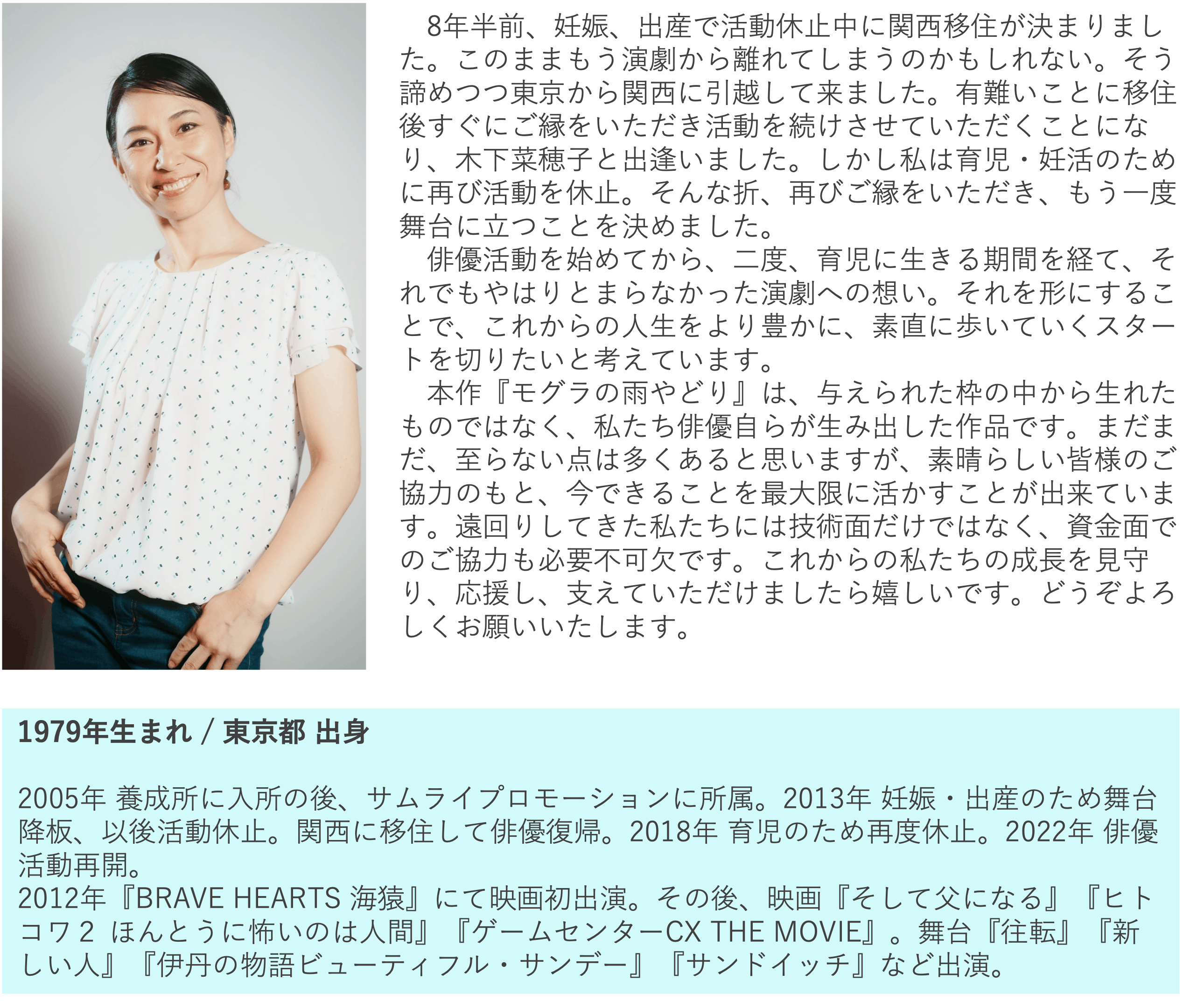 二人とも若い頃は東京にて活発に演技活動をしていましたが出産や育児をきっかけに木下は11年、井田は約7年のブランクを経て、関西に拠点を移し絶賛奮闘中!!