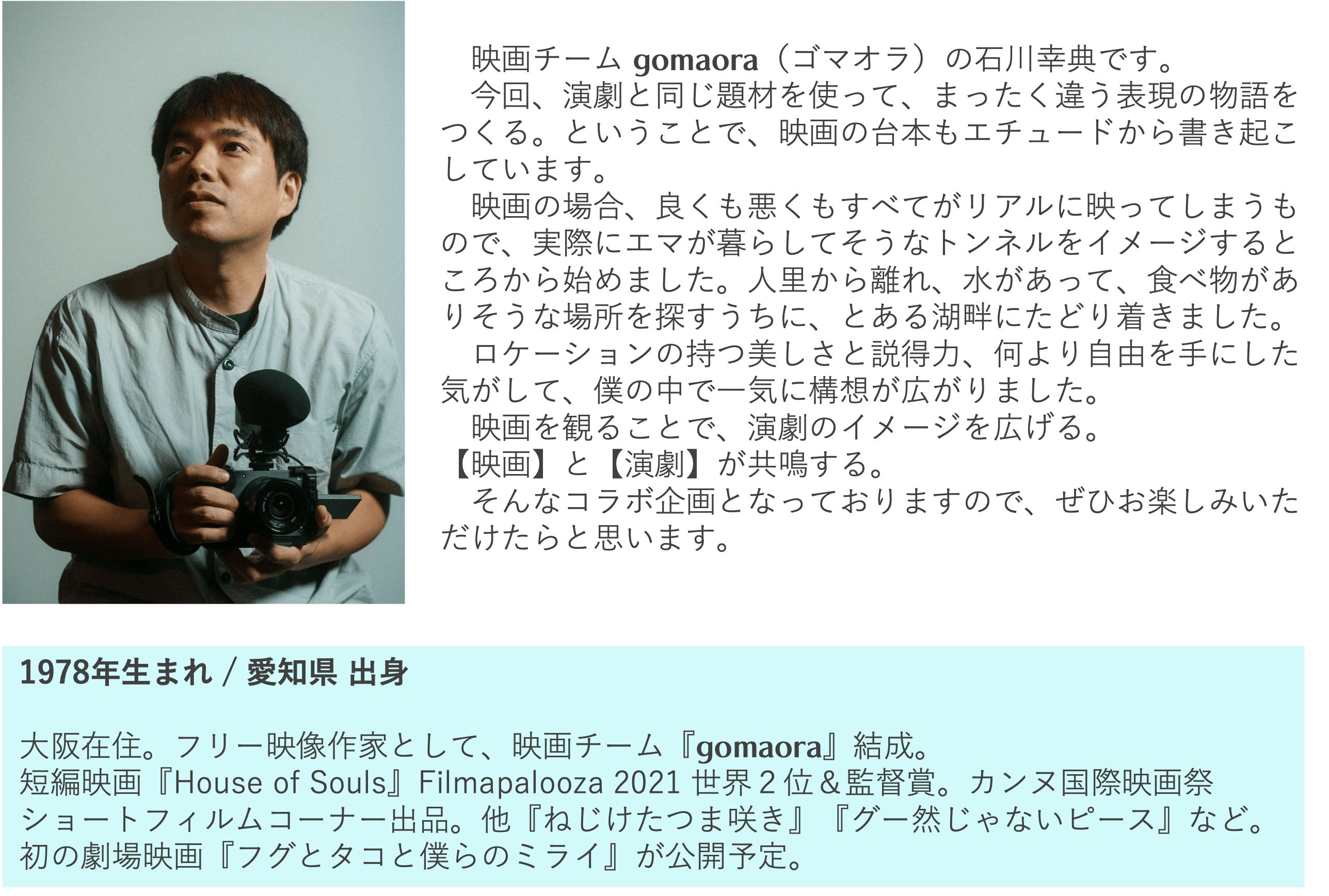 幸いにも今回、映画チーム『gomaora(ゴマオラ)』とのコラボレーションが決まり、それならば演劇作品の中で映像を使う手法ではなく、同じ題材、同じ場所での【演劇】と【映画】それぞれ違った表現で、物語『モグラの雨やどり』が楽しめるエンターテインメントの形にしたい!!と考え、短編映画を上映した会場がそのままセット転換され舞台となり、演劇を上演するという、 映画と演劇を融合させた、色んな視点で「芸術表現」をお楽しみいただけるコンセプトとなりました。