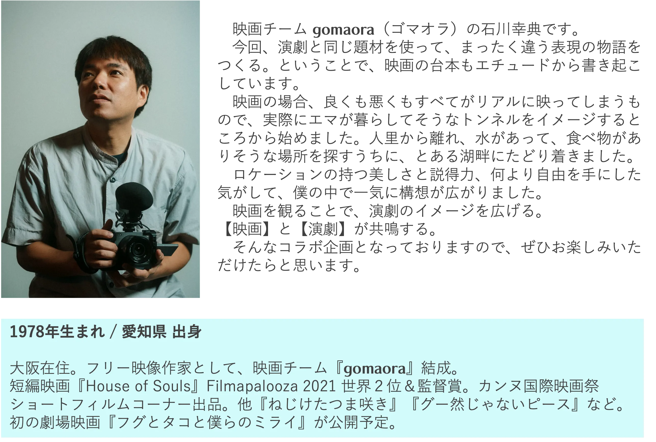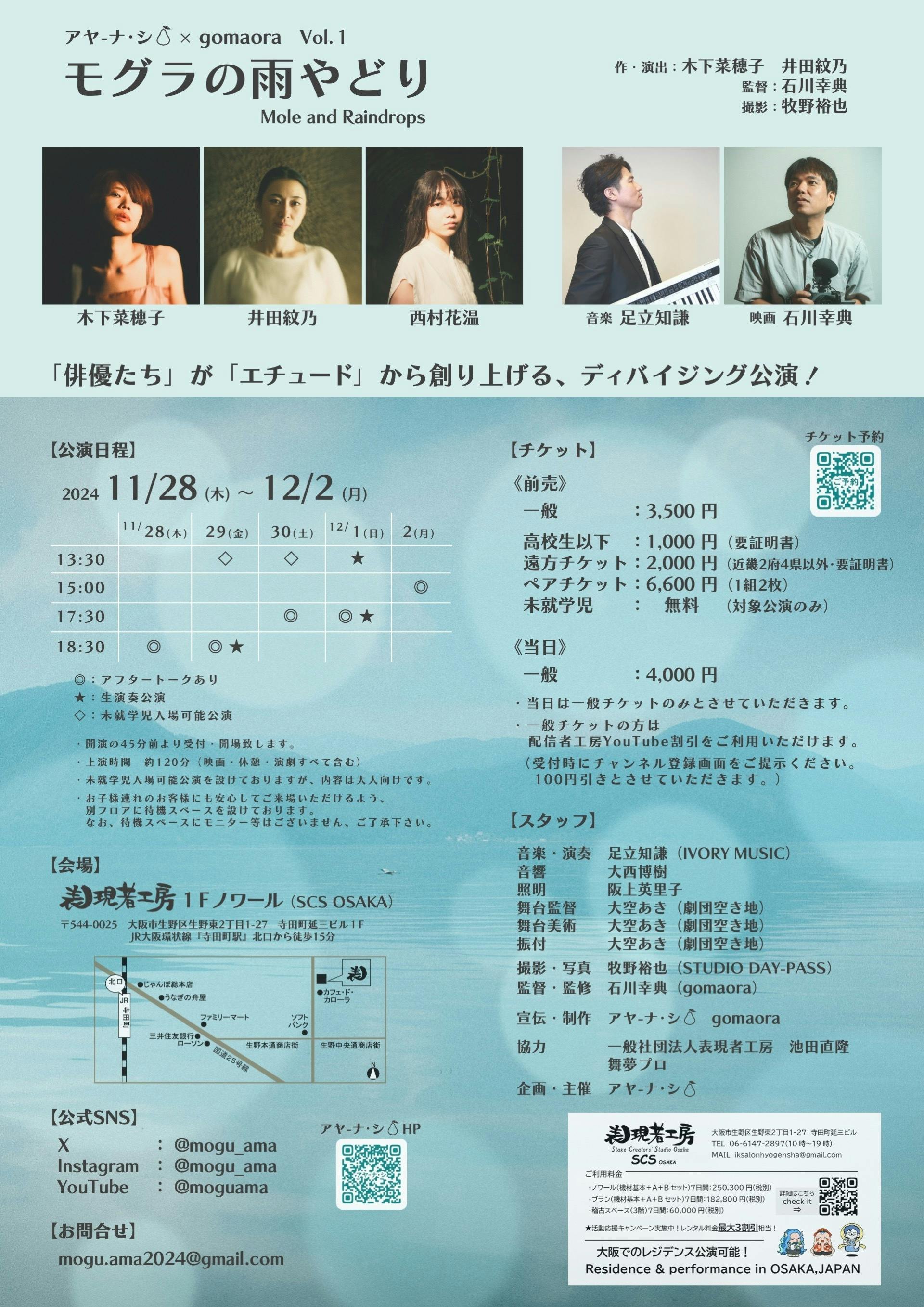 幸いにも今回、映画チーム『gomaora(ゴマオラ)』とのコラボレーションが決まり、それならば演劇作品の中で映像を使う手法ではなく、同じ題材、同じ場所での【演劇】と【映画】それぞれ違った表現で、物語『モグラの雨やどり』が楽しめるエンターテインメントの形にしたい!!と考え、短編映画を上映した会場がそのままセット転換され舞台となり、演劇を上演するという、 映画と演劇を融合させた、色んな視点で「芸術表現」をお楽しみいただけるコンセプトとなりました。