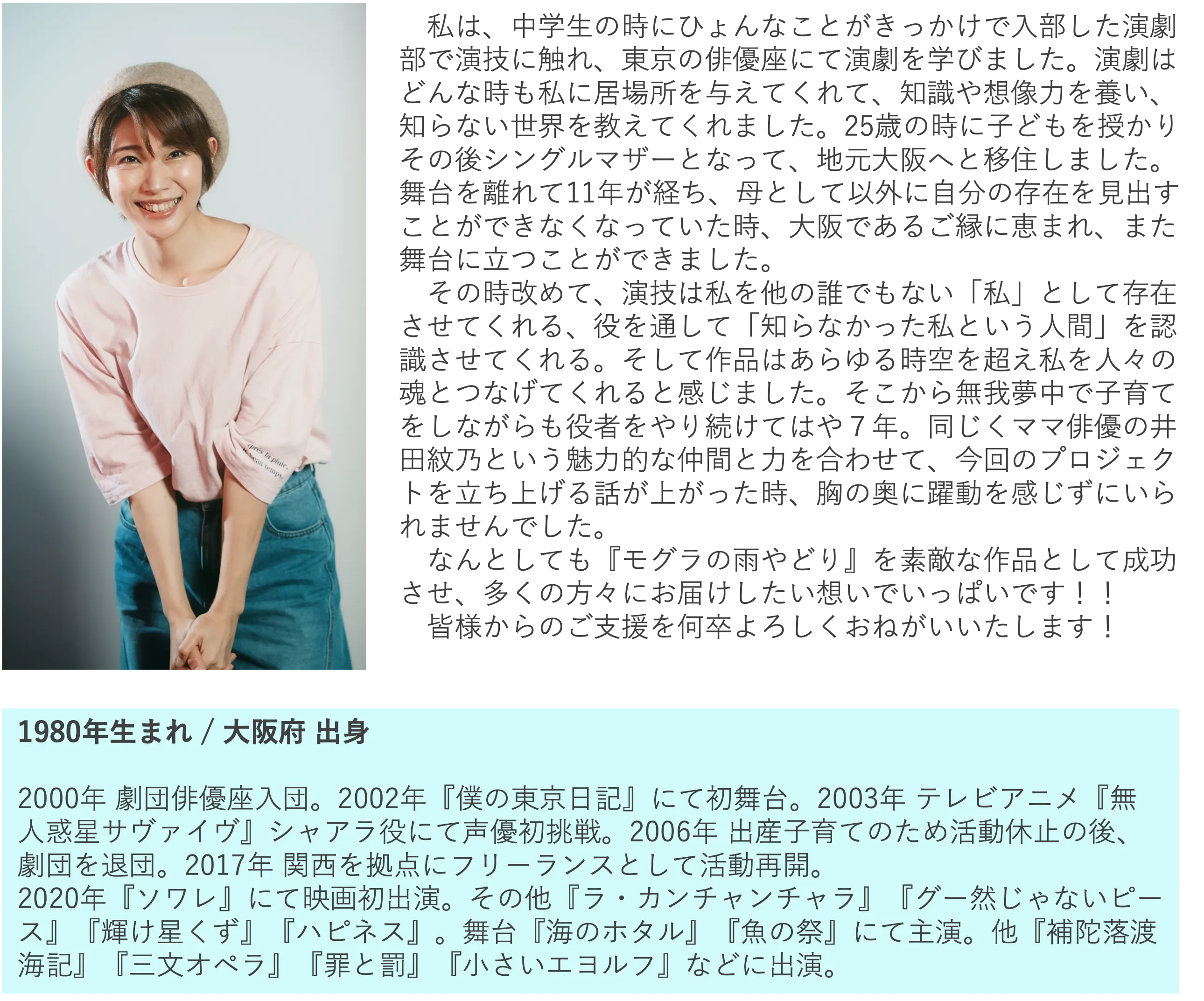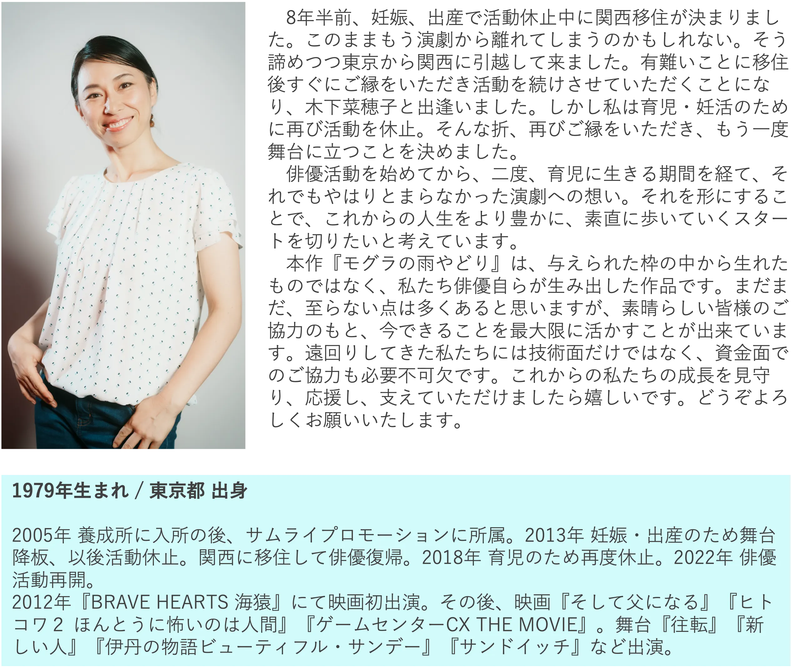 二人とも若い頃は東京にて活発に演技活動をしていましたが出産や育児をきっかけに木下は11年、井田は約7年のブランクを経て、関西に拠点を移し絶賛奮闘中!!
