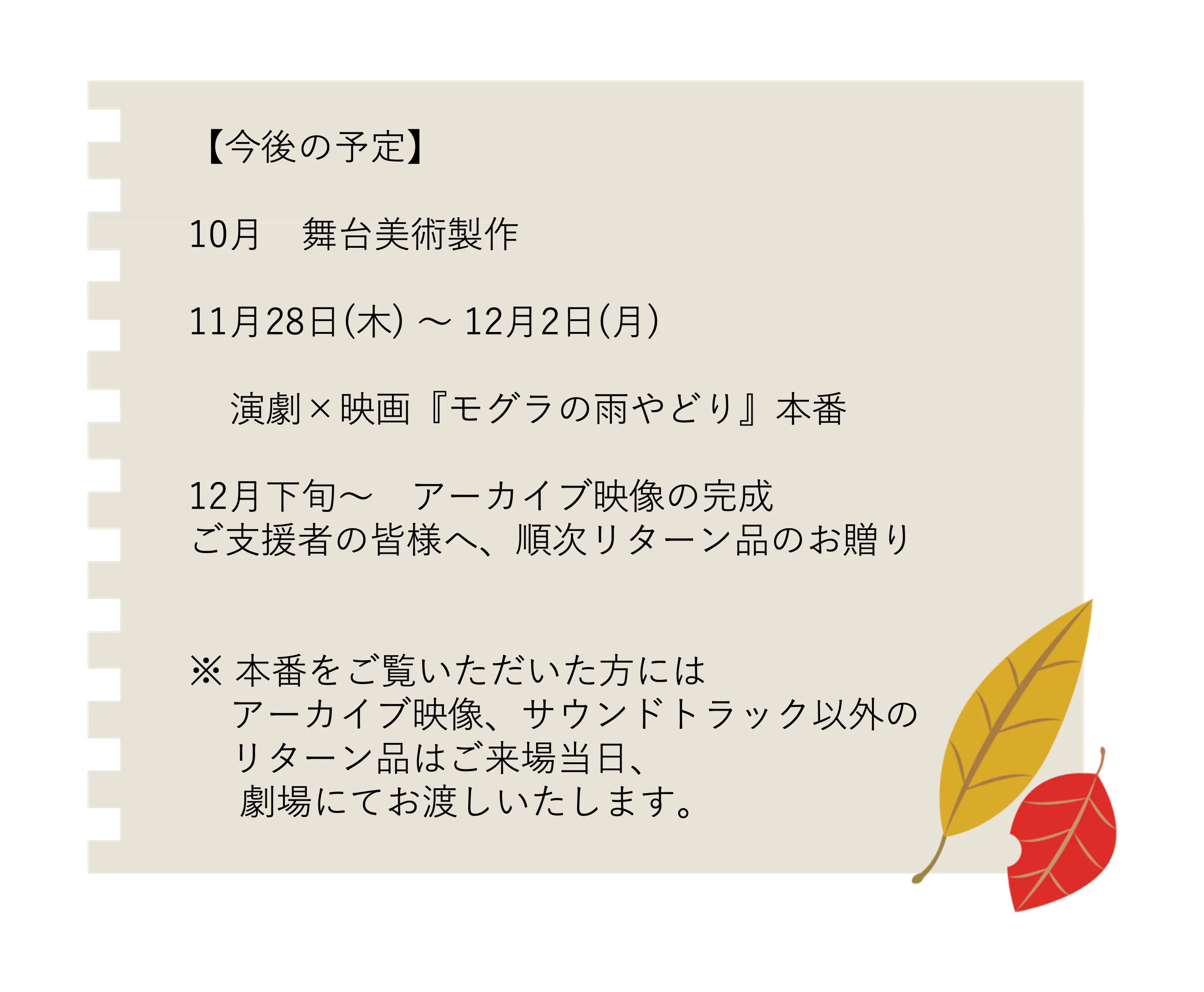 『モグラの雨やどり』がお客様を幻想的でワクワクする世界へと誘えますよう、お一人でも多くの方にお届けできますよう、そしてこの作品に携わるすべての方が笑顔で千穐楽を迎えられますよう、どうか皆様のご協力をよろしくお願いいたします!!!✨✨