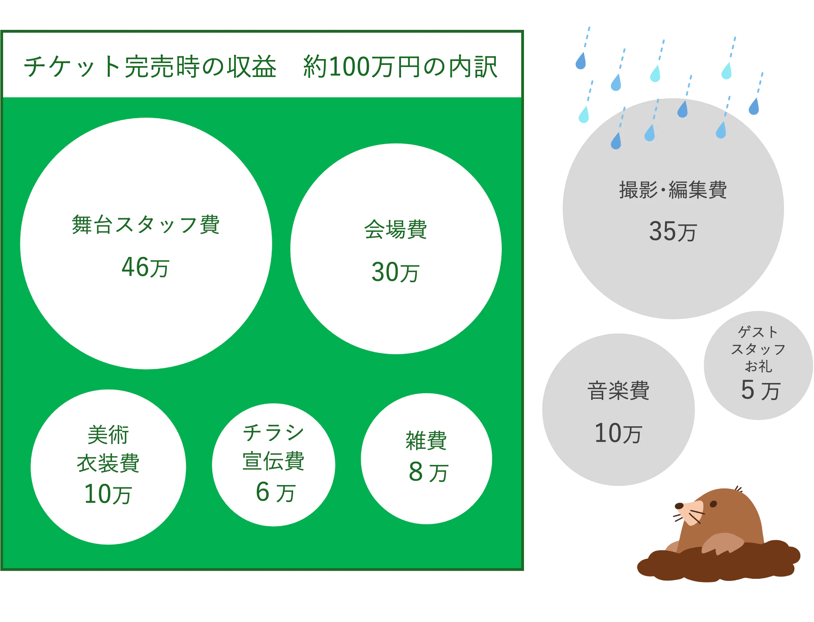 今回、公演チケットが全席完売したとしても、劇場費、舞台関係のスタッフさんへの最低限の支払いができる程度。映画やスチール、音楽、宣伝に関係する出費はほぼ持ち出しとなる状況です。