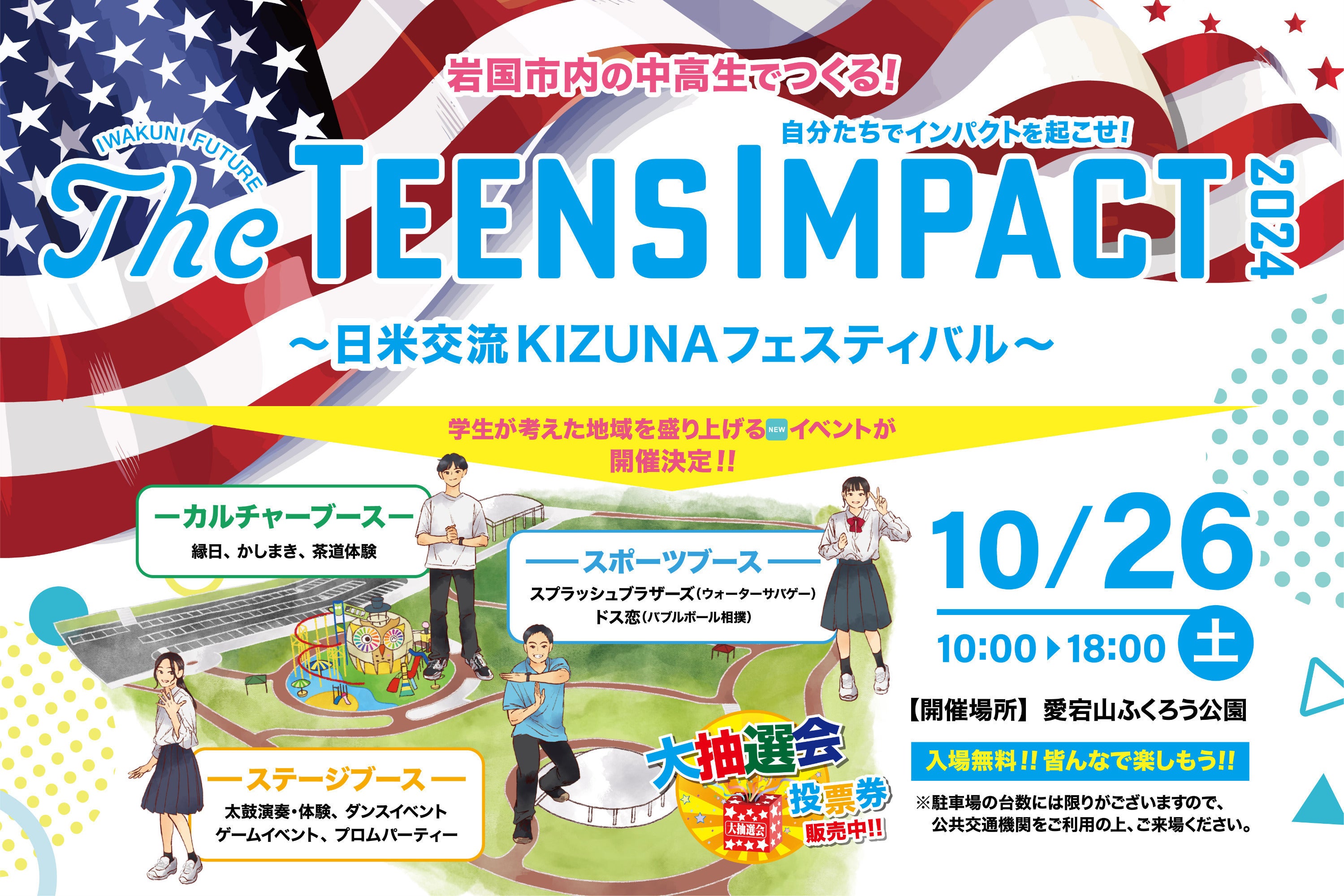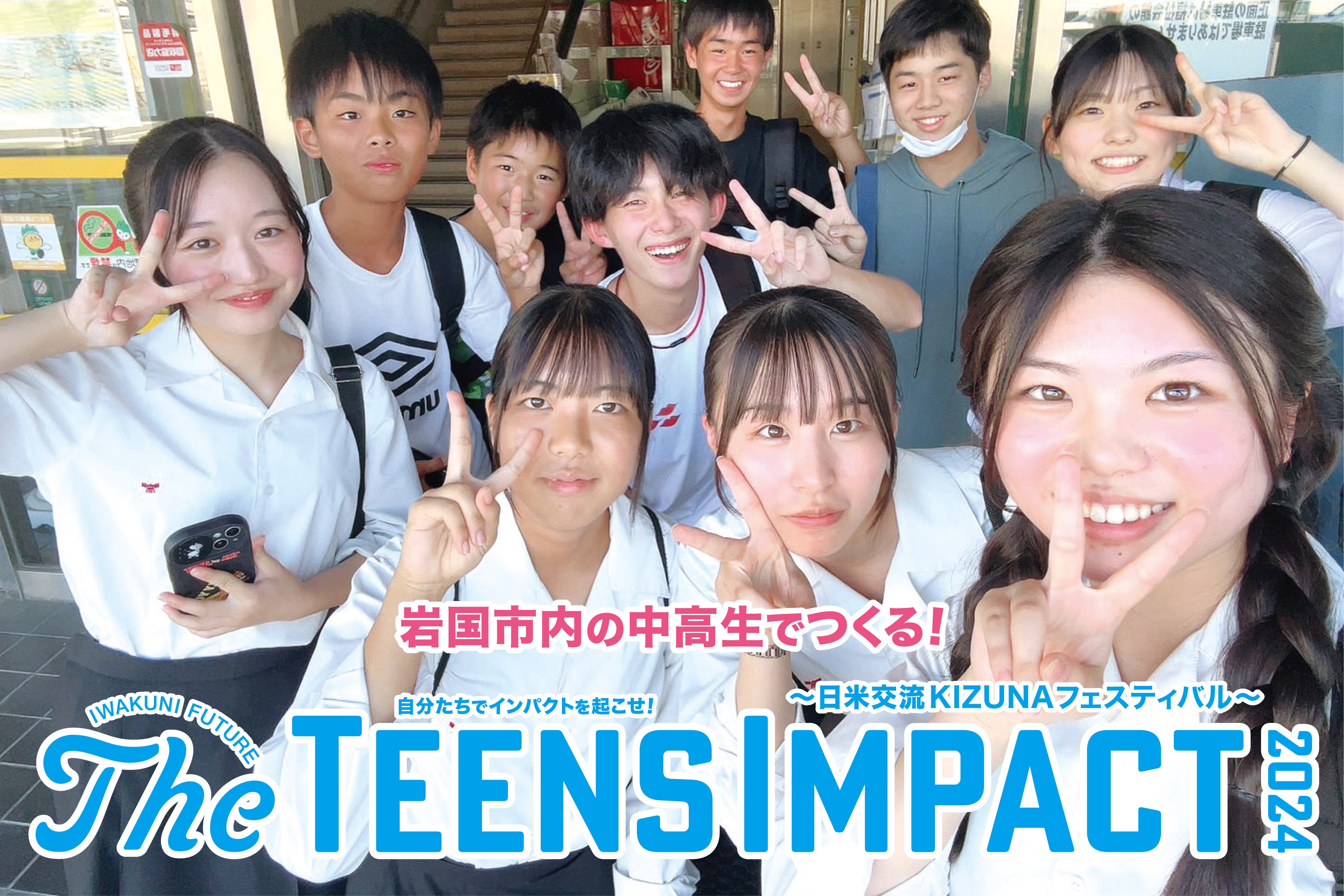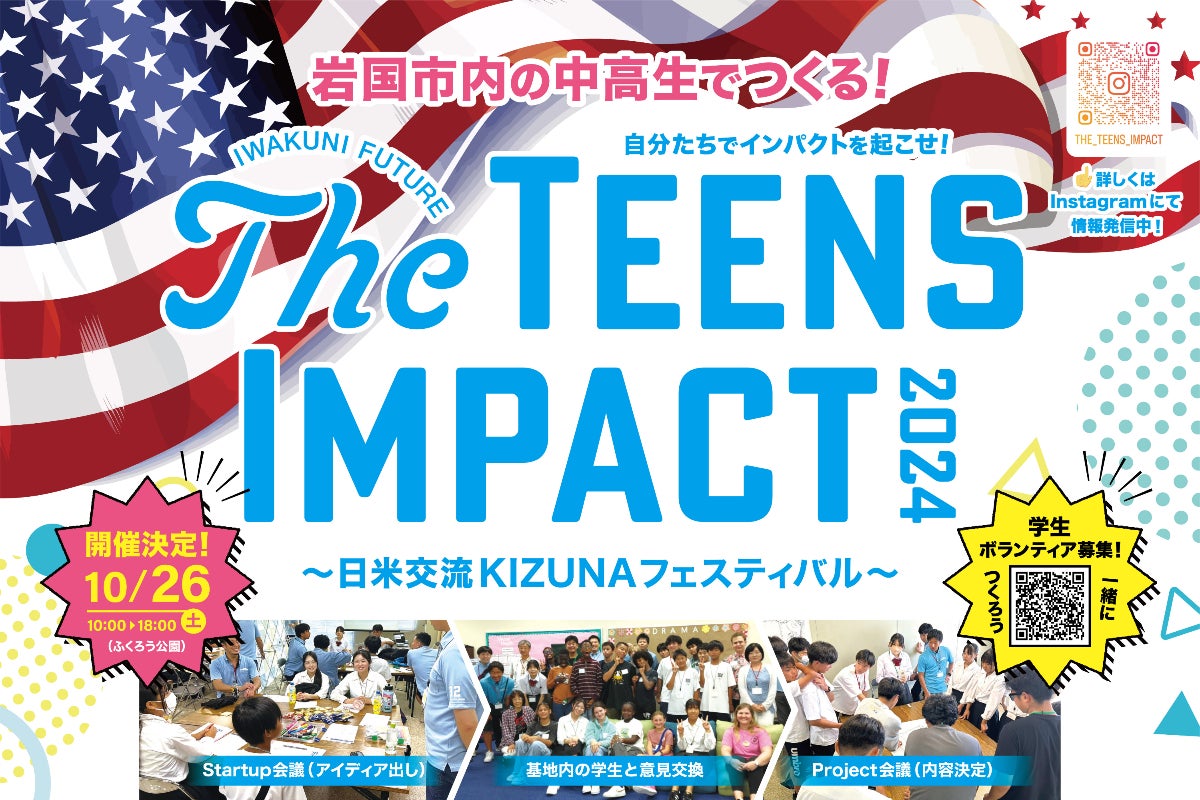 2024年10月26日(土)に「愛宕山ふくろう公園」にて、『 The TEENS IMPACT 2024 〜日米交流KIZUNAフェスティバル〜 』の開催を計画しております!!! 学生の私たちが考えたフェスであり、岩国市の特性でもある基地のある街として『日米交流』をテーマとしております!!!