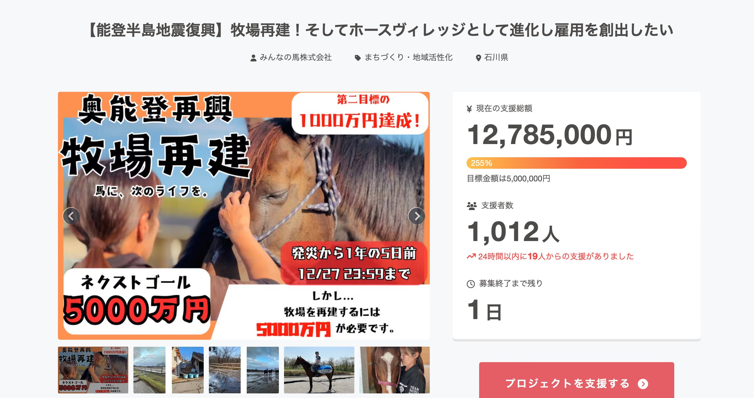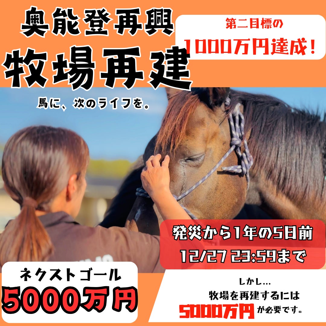 ご支援者数1,000人突破いたしました!多くの方にご支援いただけて大変ありがたく思います。拡散にご協力いただきまして、誠にありがとうございます。そして明日27日が最終日です!第一目標の500万円は到達いたしました。しかし、創造的復興の実現、自律分散型ファーム(通称 オフグリットホースヴィレッジ)の実現にはまだまだ資金が足りないのが現状です。現在12,785,000円のご支援をいただいておりますが、実現には50,000,000円の資金が必要となります。最後の最後まで、みんなの馬株式会社は創造的復興の実現を諦めません!ぜひ最後まで拡散とご支援をお願いいたします!また大澤・足袋抜・角居よりメッセージをお届けしておりますので、ご覧いただければと思います。https://www.instagram.com/reel/DD3IZbkvwPn/?igsh=aXRnY3FteDNzOHhz大澤より、約1年が経った珠洲市・珠洲ホースパークの様子を語っております。https://www.instagram.com/reel/DD8SBaRPHRG/?igsh=am9rbXlyc2s5NnI1足袋抜より、皆さまへメッセージ。https://www.instagram.com/reel/DD-2u2ZPGx9/?igsh=MXUzMGUxM2oxbWswcQ==角居より、皆さまへメッセージ。
