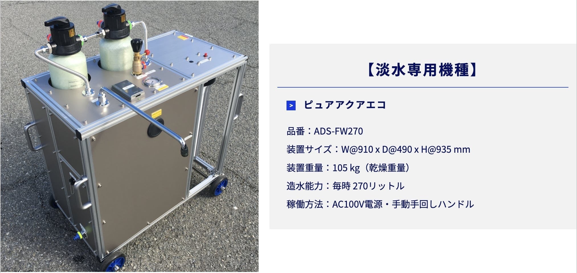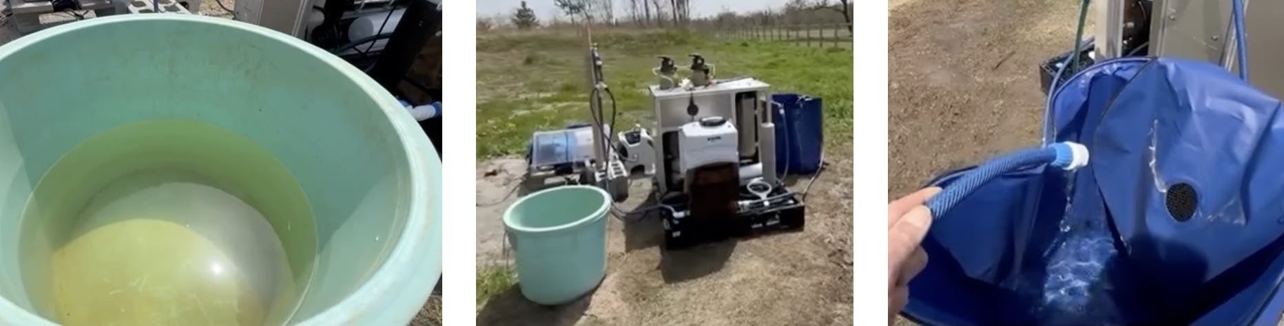 左_浄化前の井戸水、中央_浄化装置、右_浄化後の透き通った水