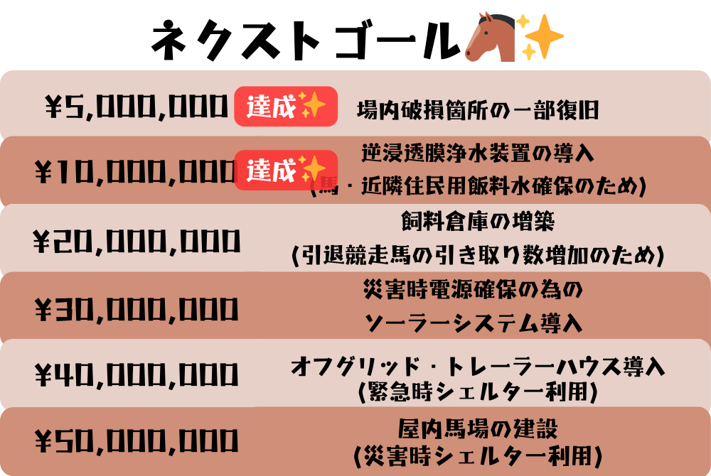 目標達成おめでとうございます。 震災そして豪雨被害で馬達も人も大変な時期を過ごされたことと思います。 どうかこれからは、馬達第一の生活が送れますよう心より願ってます。 どうか馬達のこと宜しくお願いします。