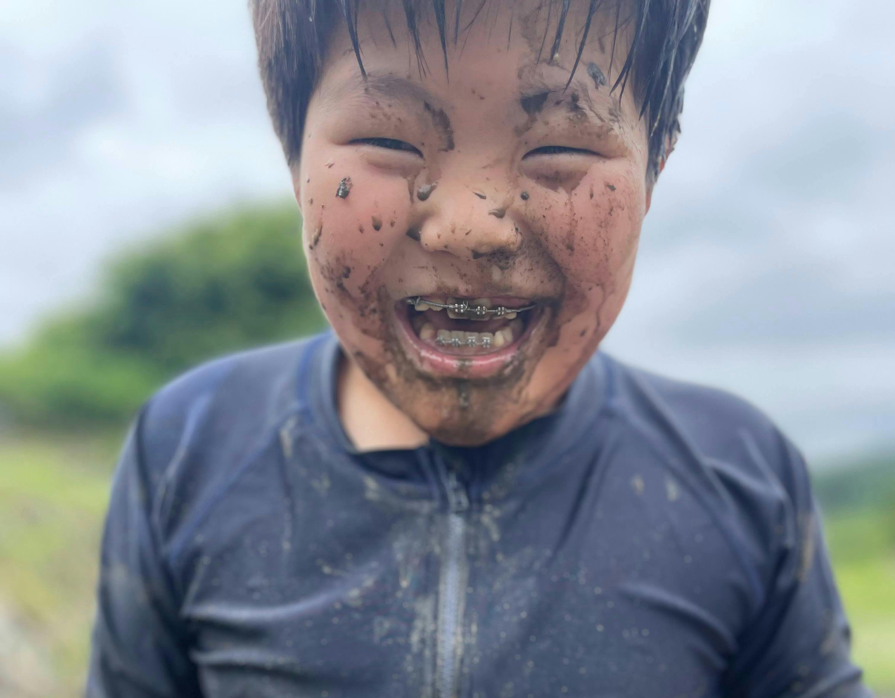 穴掘りに夢中になった泥だらけの笑顔