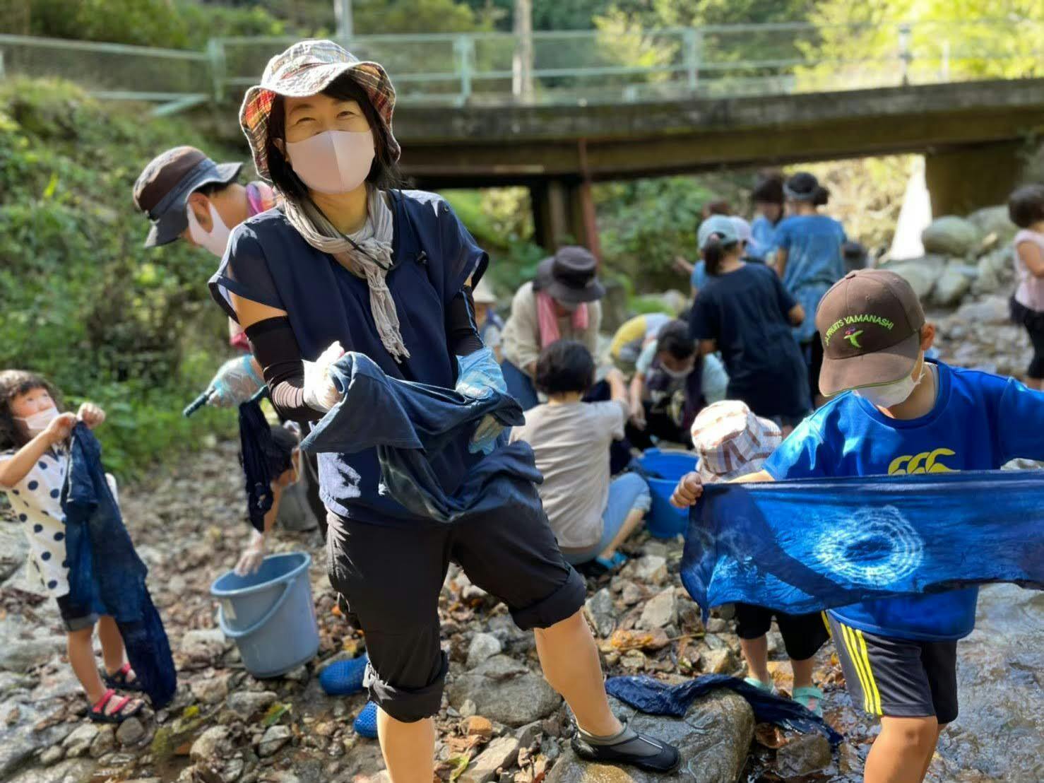 ↑自然の川の中で行う親子藍染体験!冷たい川の水の中、どんなふうに染まるかドキドキ!