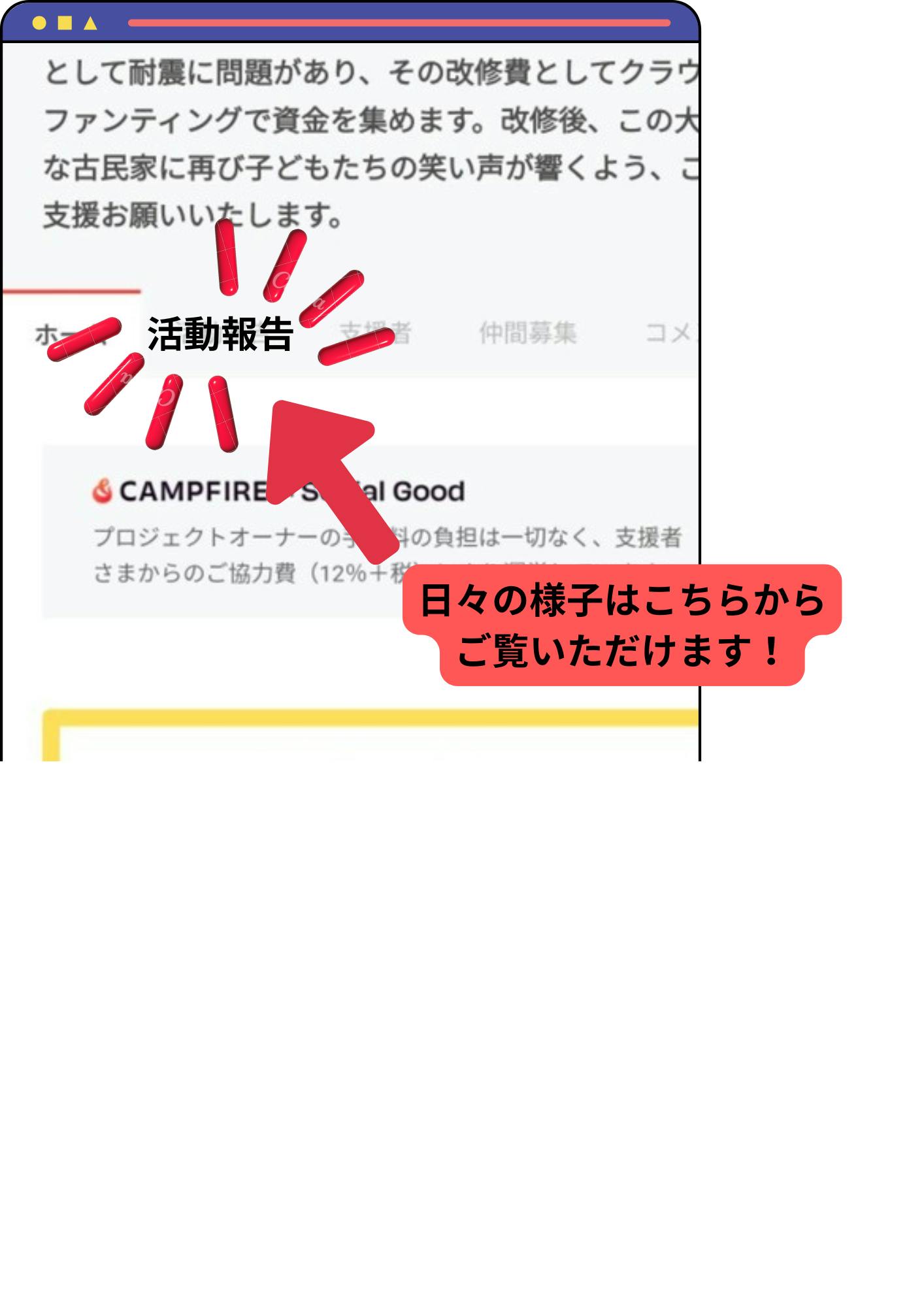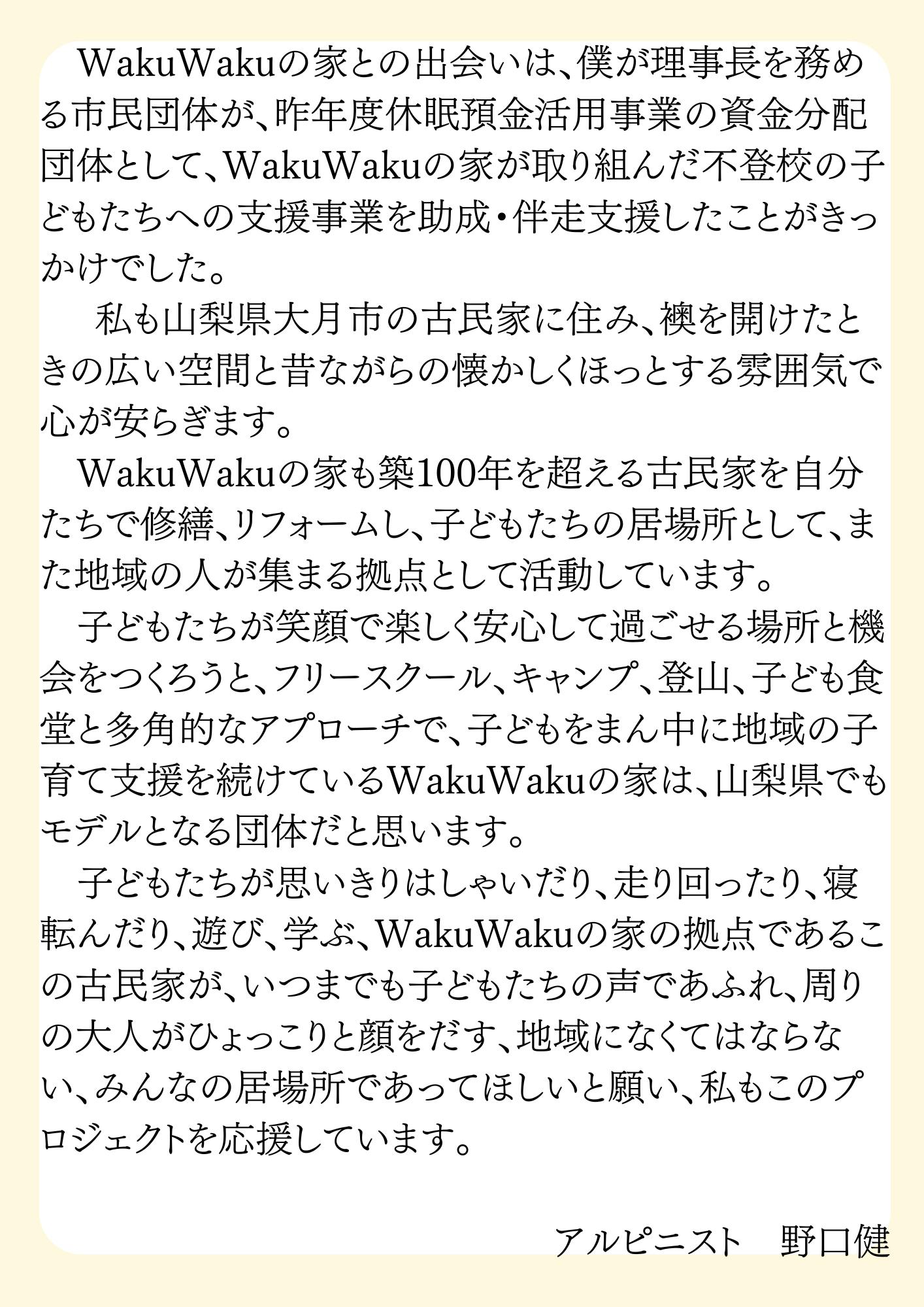 2025/11/20 06:30皆様、本当にありがとうございました!769名の方がご支援くださり、総額20,595,414円のご支援を集めることが出来ました。私たちだけではとても達成する事の出来ない結果を手にし、いま、感謝の気持ちで胸がいっぱいです。しかし、これからが本番です!私たちの想いに共感してくださった方々の大切なご支援を、子どもたちの為に使わせていただきます。私たちにできる事は、子どもたちの成長をサポートする事、そして社会に還元していく事。その任務を皆様の想いを背負って全うしていきます!今後の工事のスケジュールや、完成披露パーティのお知らせ、古民家での子どもたちの様子など、この活動記録にてこれからも発信していきます。どうぞ末永く、WakuWakuの家をあたたかく見守っていてください。よろしくお願いいたします。2025年11月20日 スタッフ一同 もっと見る