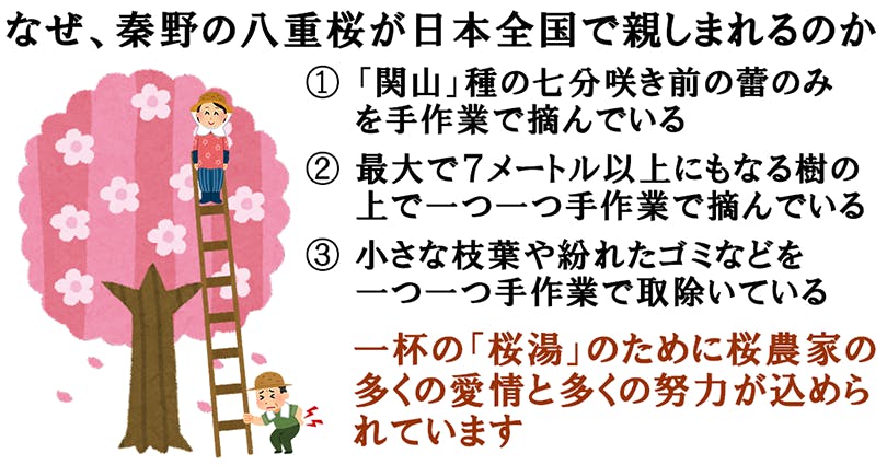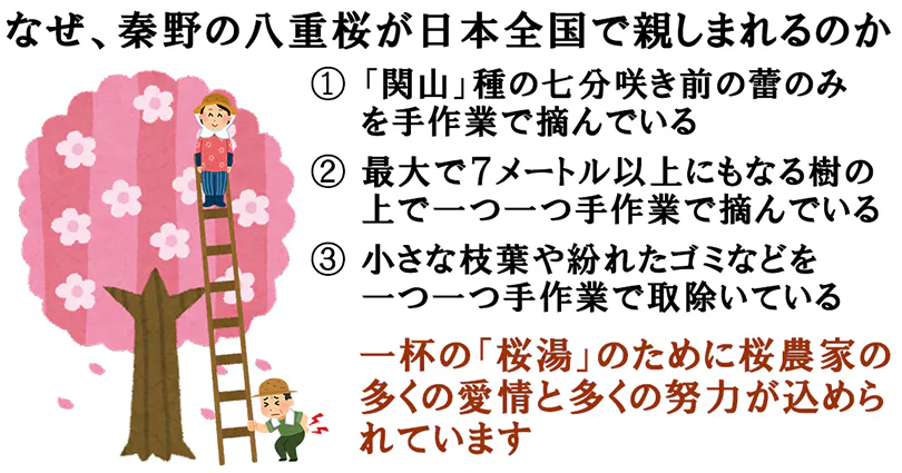 また、八重桜が成熟すると、高さは7メートルから10メートル近くに達することがあり、収穫作業は非常に危険です。これは、約7メートルの梯子を使い、その上でバランスを取りながら蕾を摘む作業を行うためです。