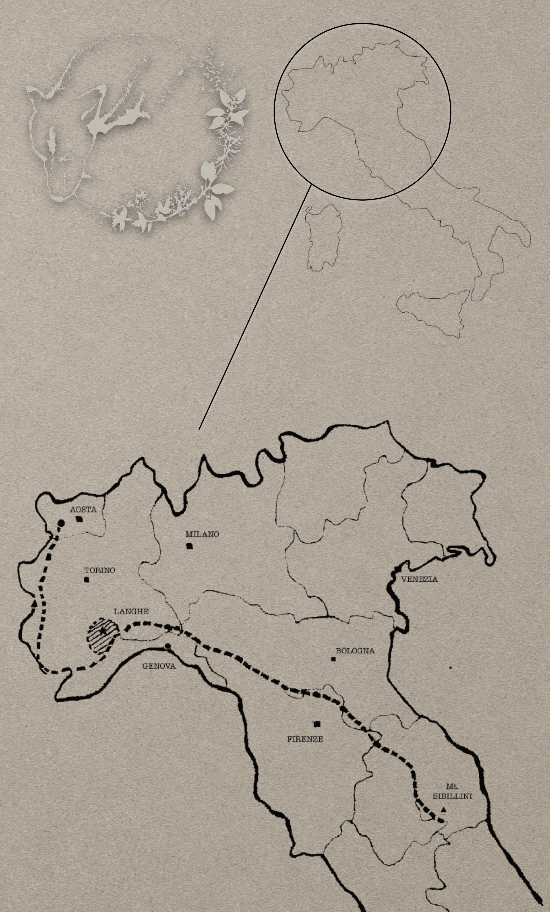 このイタリアオオカミは、イタリア中部のアペニン山脈から北部アルプス山脈への大移住の長い旅路でピエモンテのランゲ地方へと休憩地として立ち寄り、そして定着したと言われています。