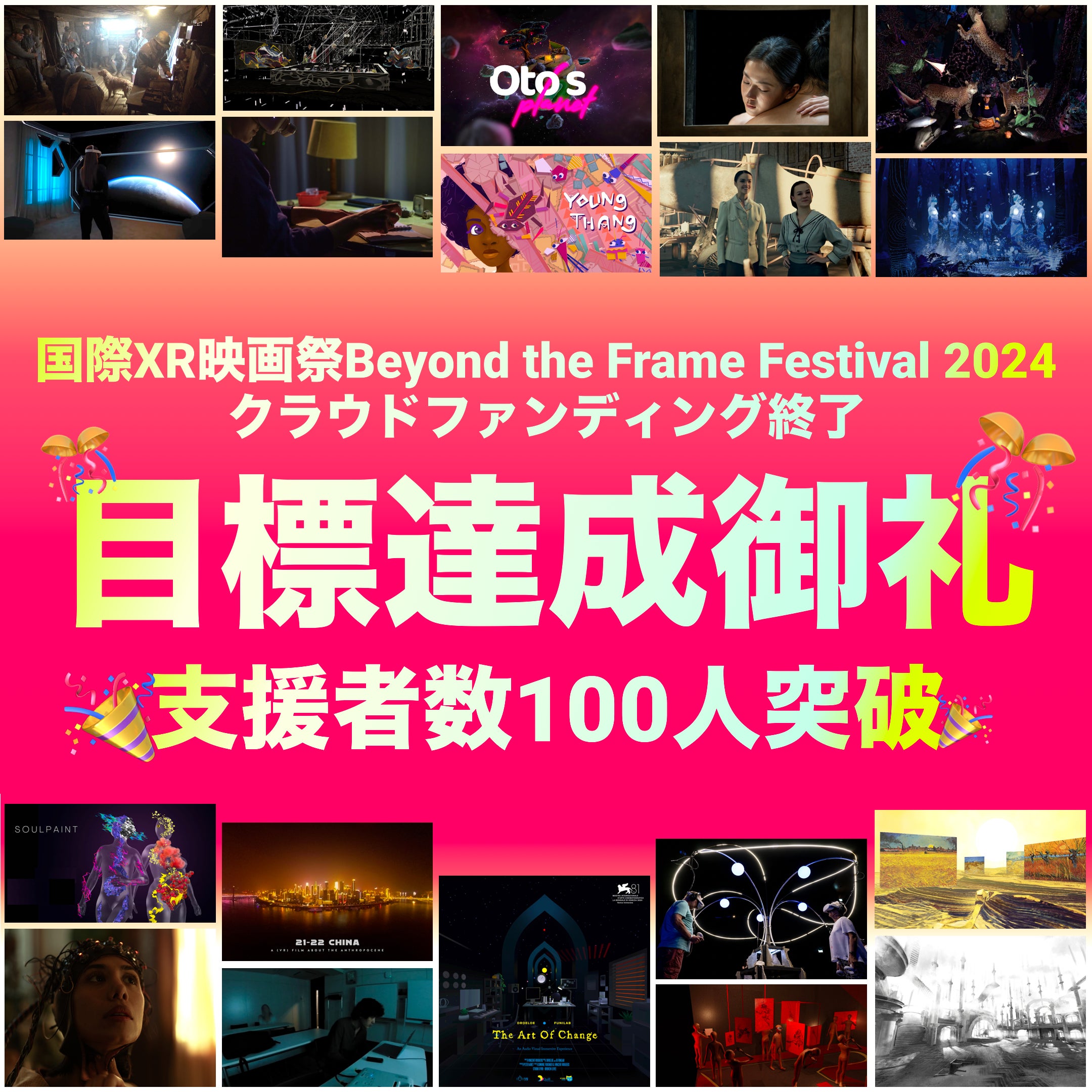 2024/10/30 13:04お陰様で国際XR映画祭 Beyond the Frame Festival 2024 が無事閉幕できました。今年はクラウドファンディングや協賛なども含め、大勢の皆様の応援をいただくことで開催することができ、素敵な感想も沢山頂戴することができました。皆様の温かいご支援、ご協力に心より感謝申し上げます。クロージング・アワードセレモニーでも、審査員の皆様から映画祭を「続ける」ことの重要性が語られました。末長くより良い映画祭を開催していくよう、一同努力してまいります。来年も何卒よろしくお願い申し上げます!また引き続き、リターンの準備をご支援者さまにはご手配してまいります。何卒よろしくお願いいたします。 もっと見る