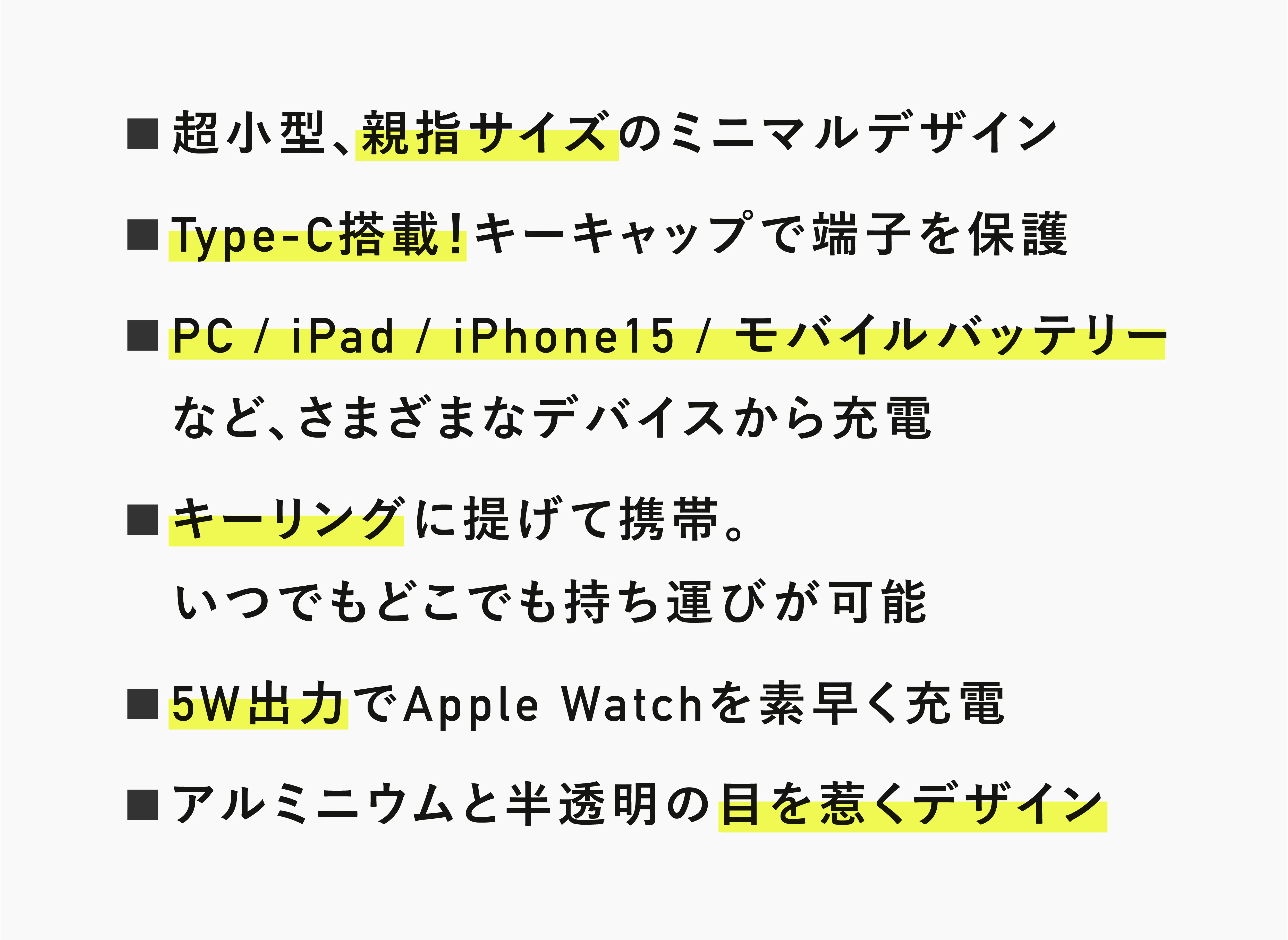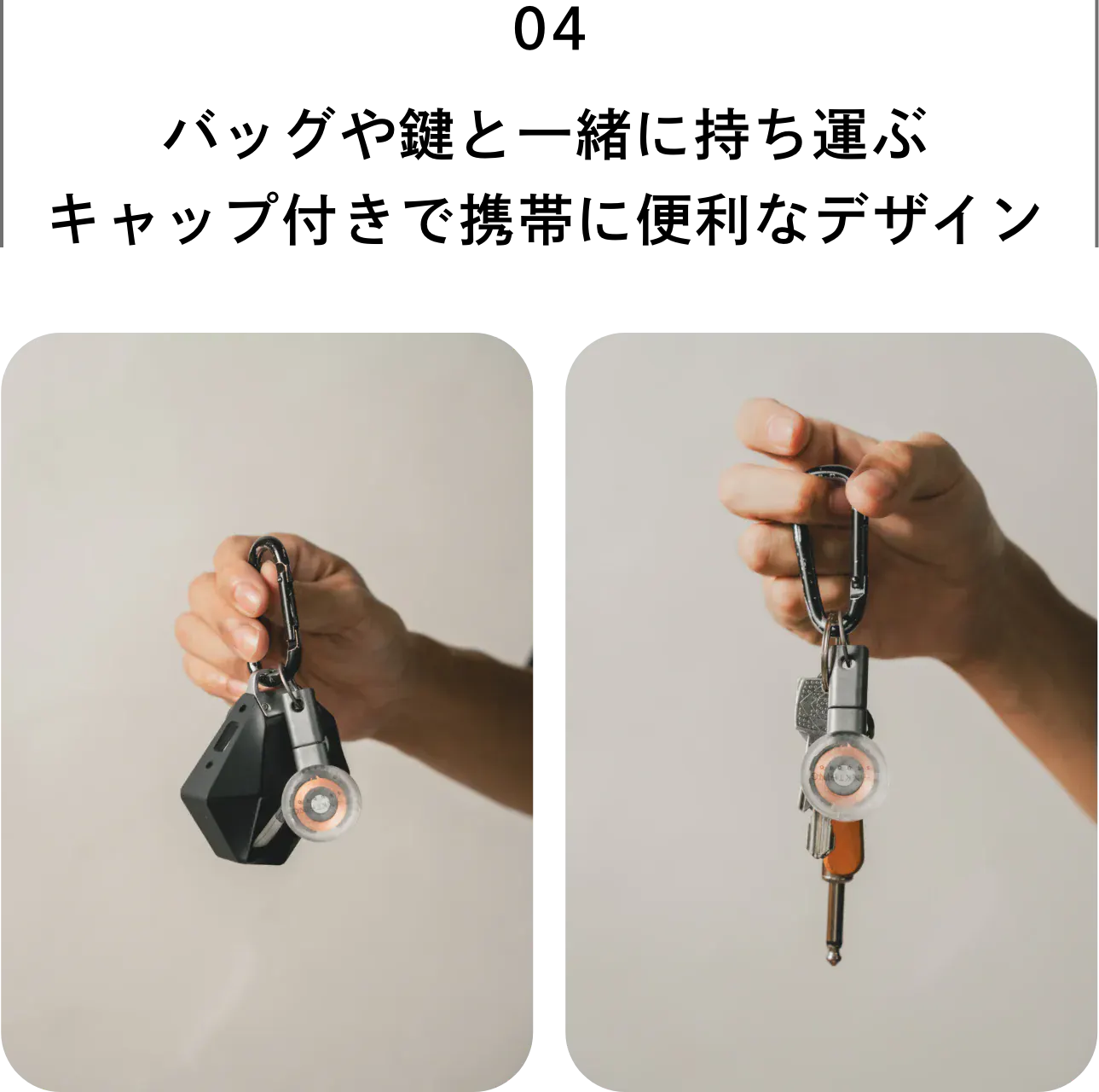 携帯に便利なリングを搭載。ポーチやカバンの中にしまう必要があった充電器をキーリングやカラビナに直接取り付けて、アクセサリー感覚で気軽に持ち運べるようになりました。
