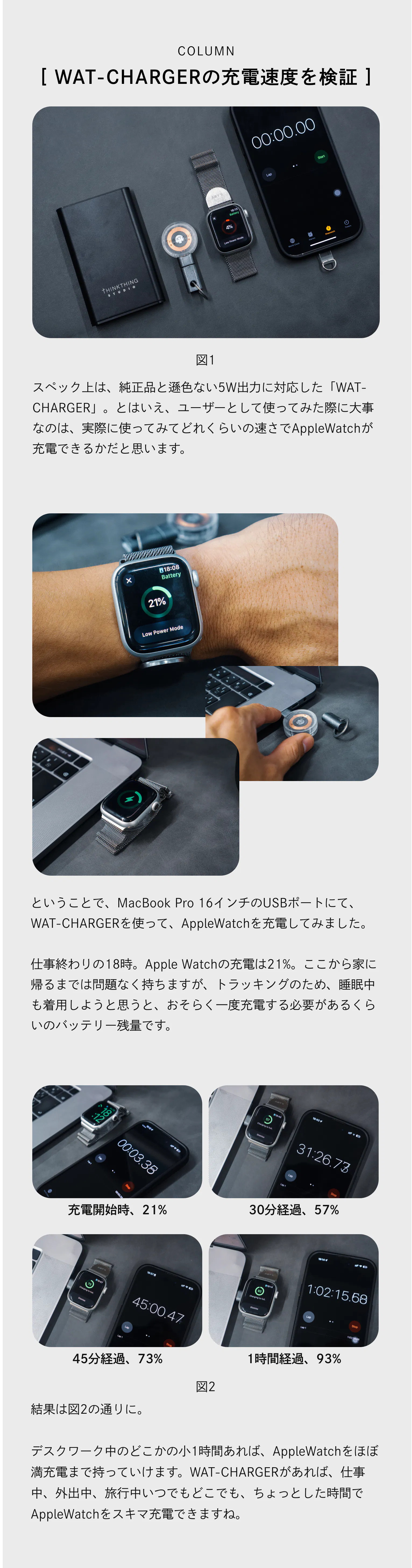 ただ、ページに記載の通りバッテリー残量21%のApple Watch(Series9)が、45分で73%、1時間で93%といった速度で充電できるため、スキマ時間に継ぎ足し充電していただくことで、Apple Watchの充電切れを防ぐといった使い方をお勧めしております。