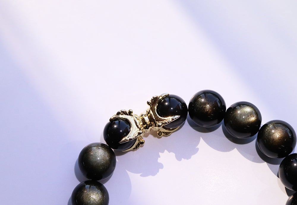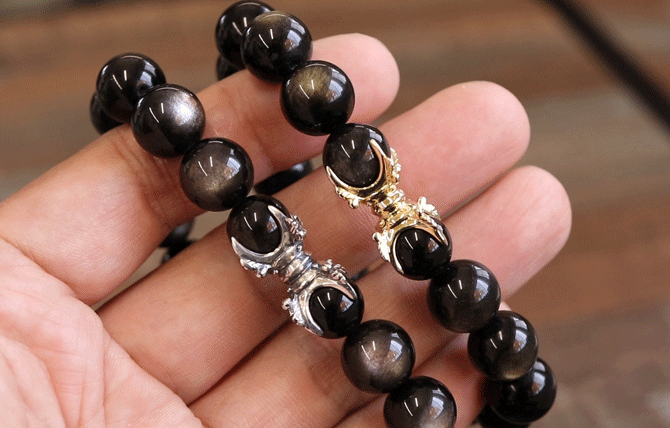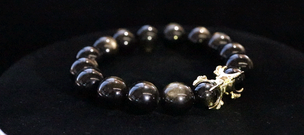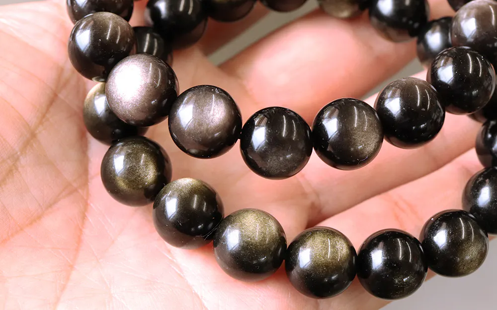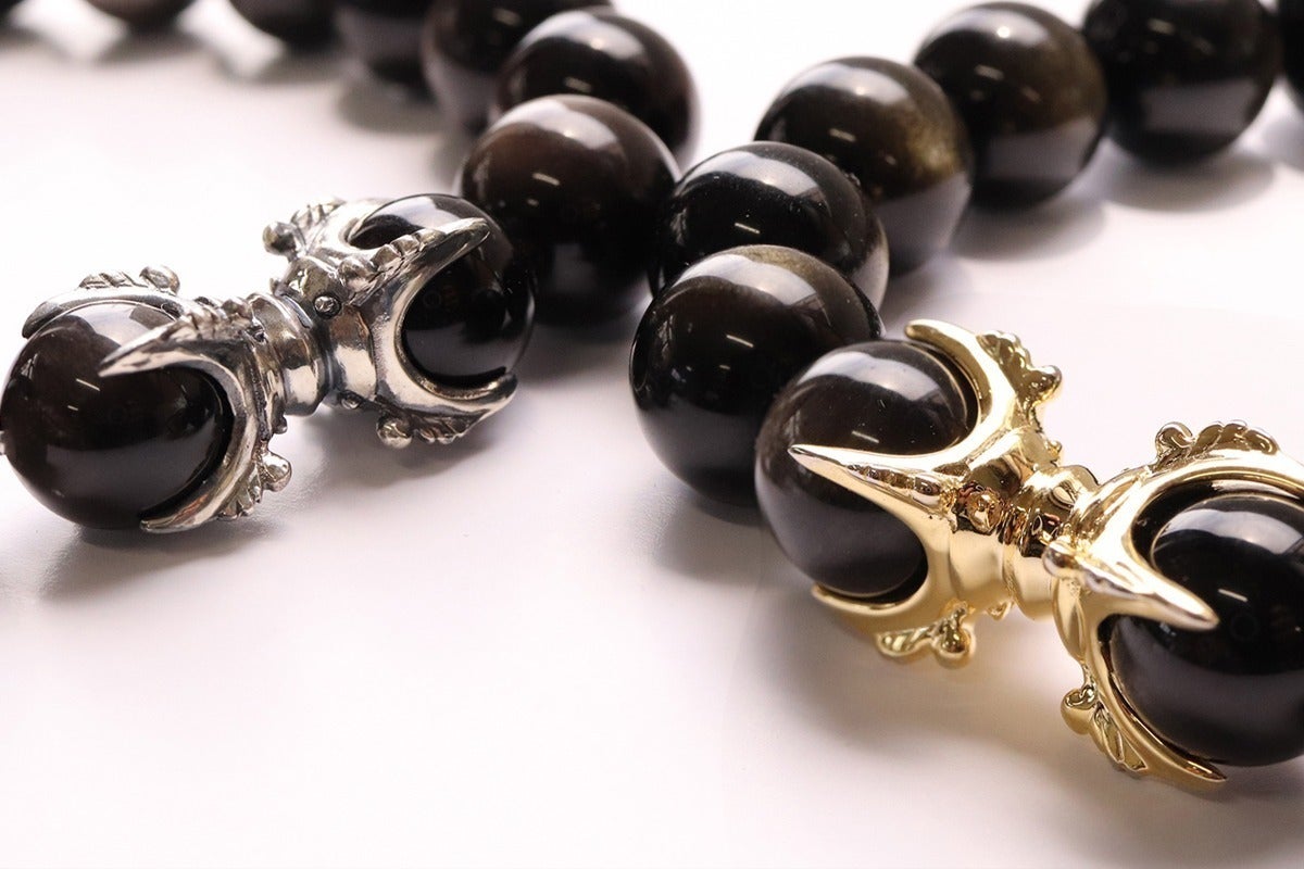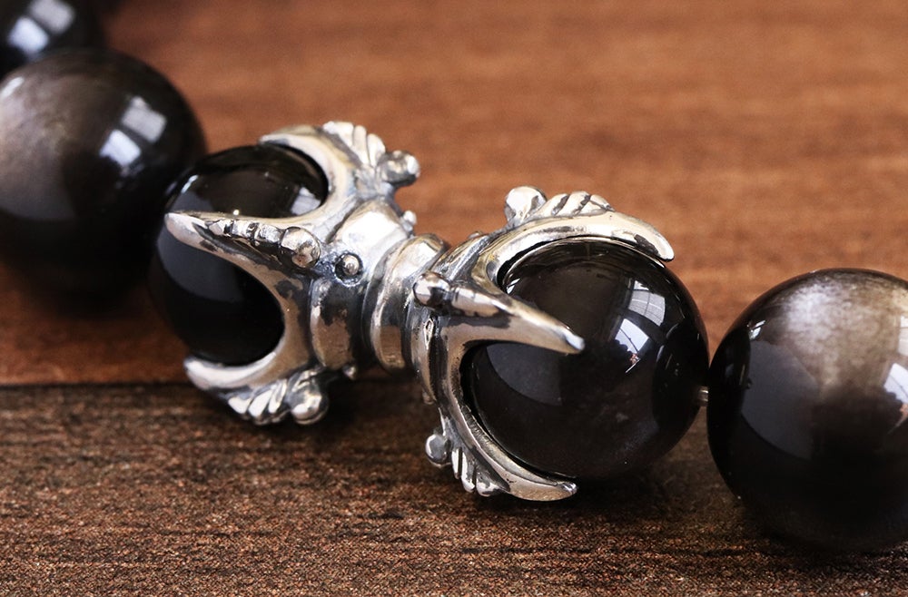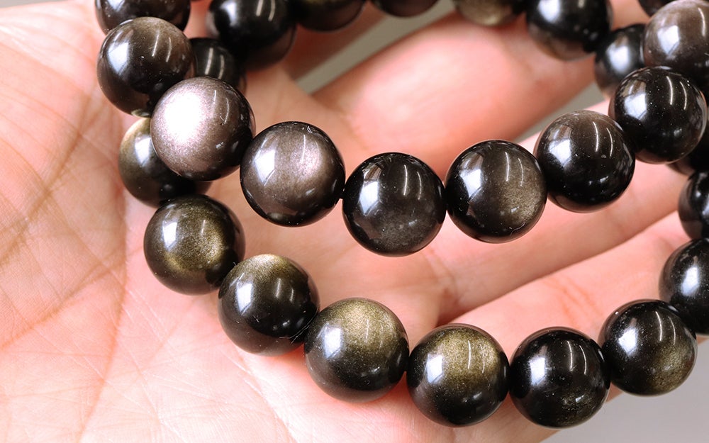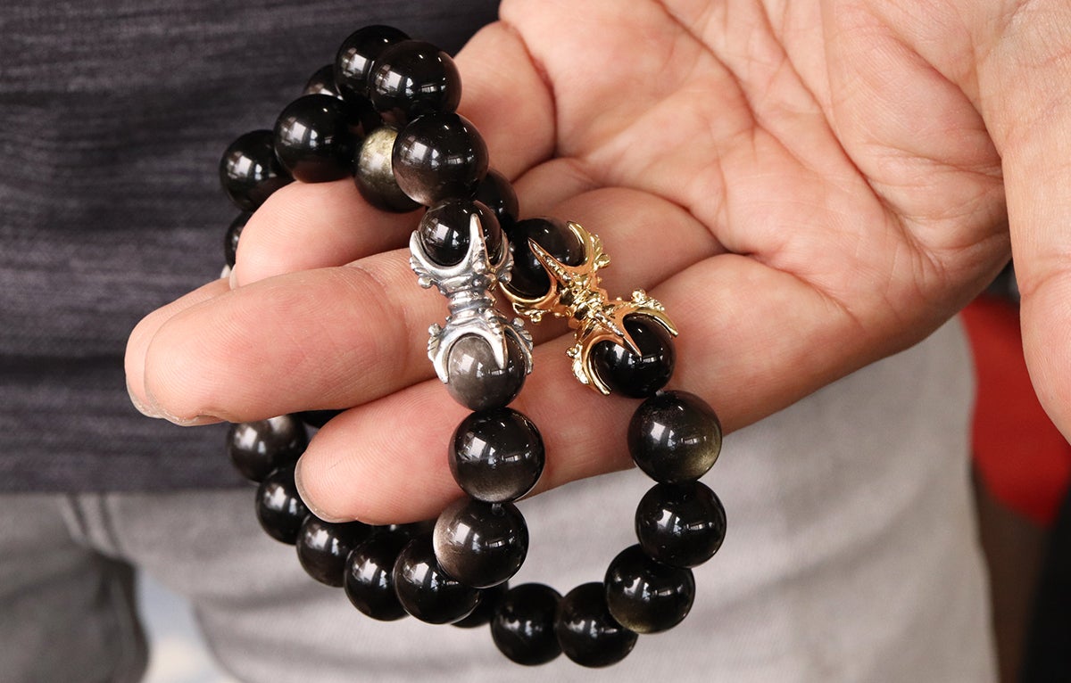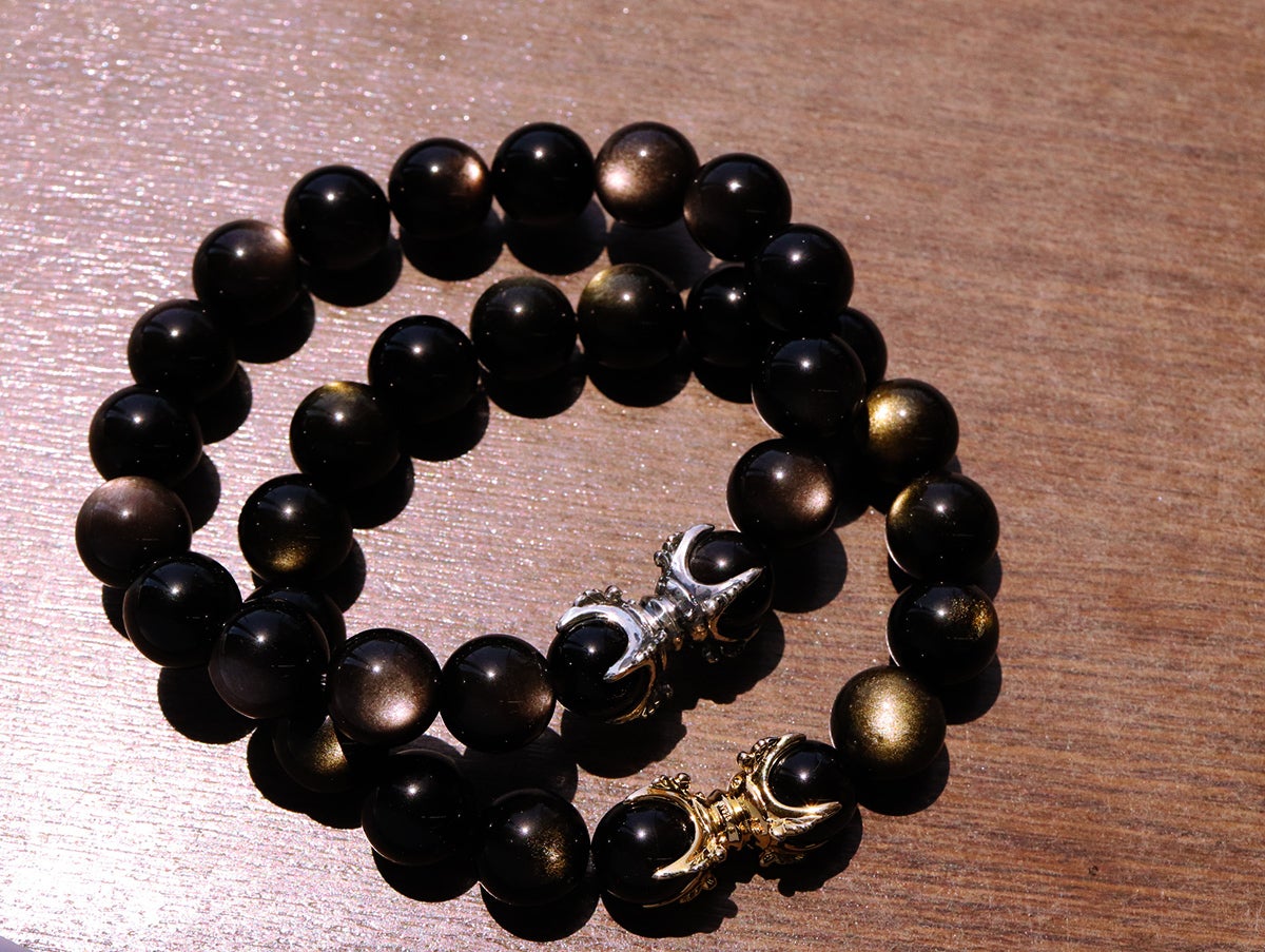 オブシディアンの中で、今回使っている「ゴールデンオブシディアン」と「シルバーオブシディアン」は、含まれた気泡や微粒子が光を反射させることでシラー(輝き)がみられる美しく神秘的な黒曜石です。