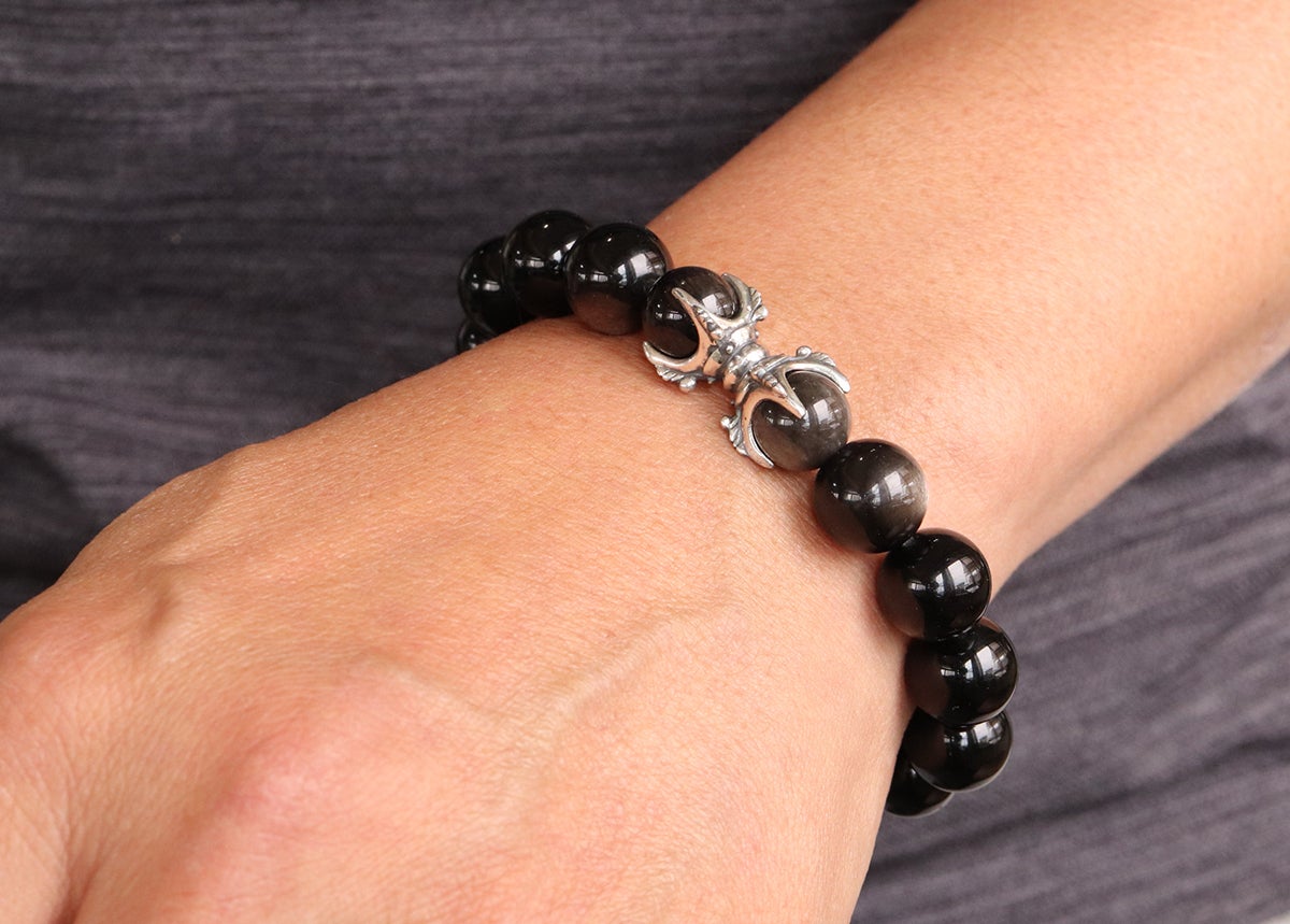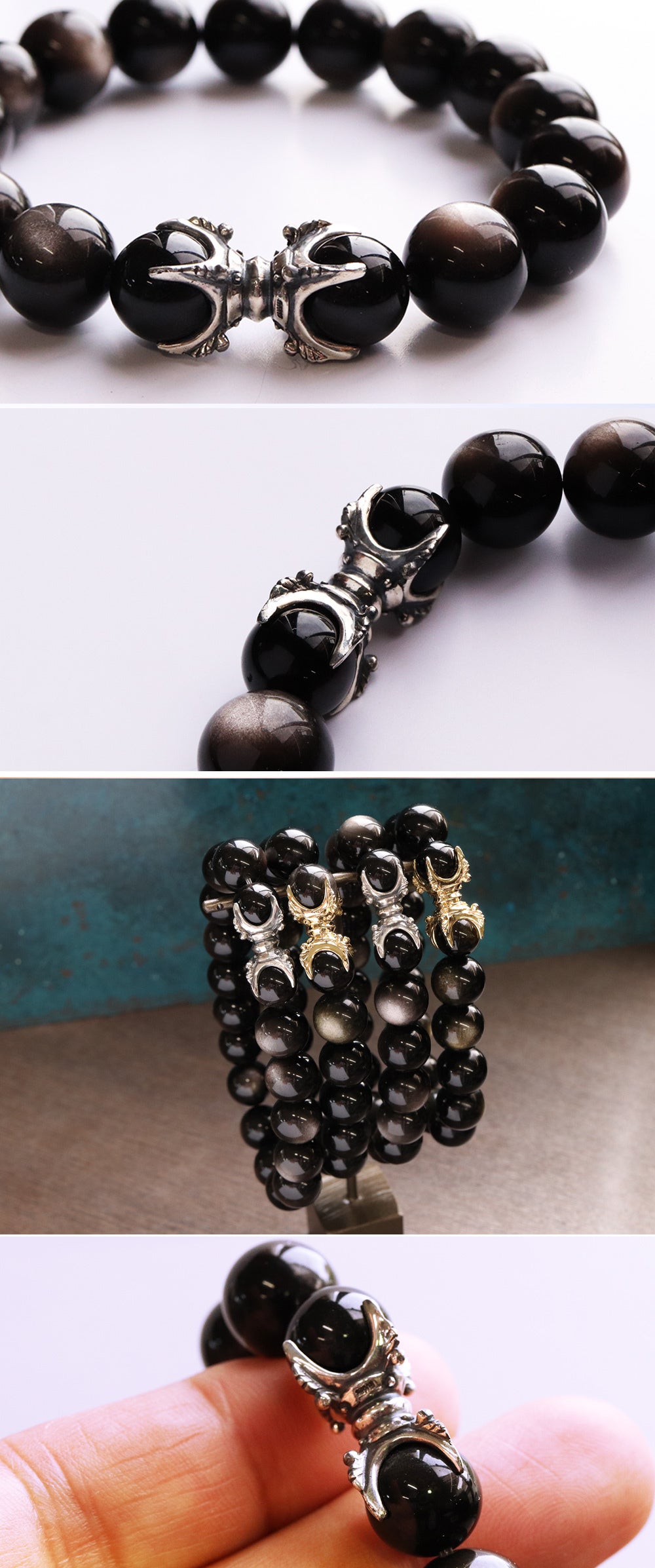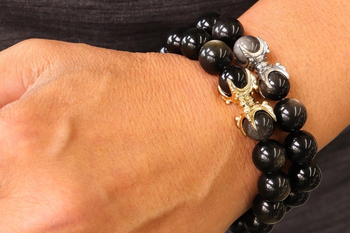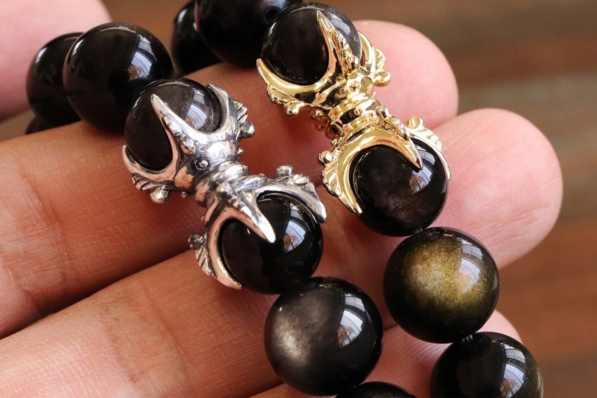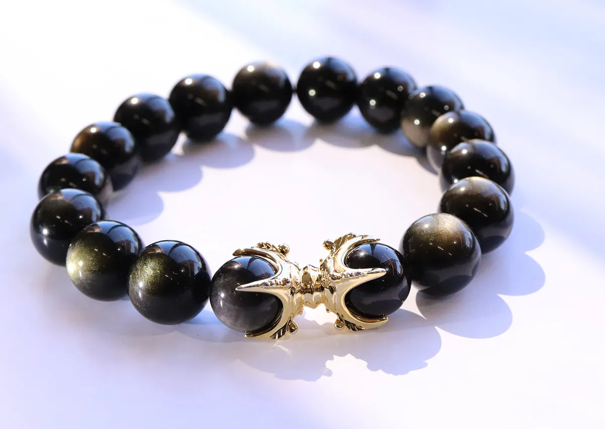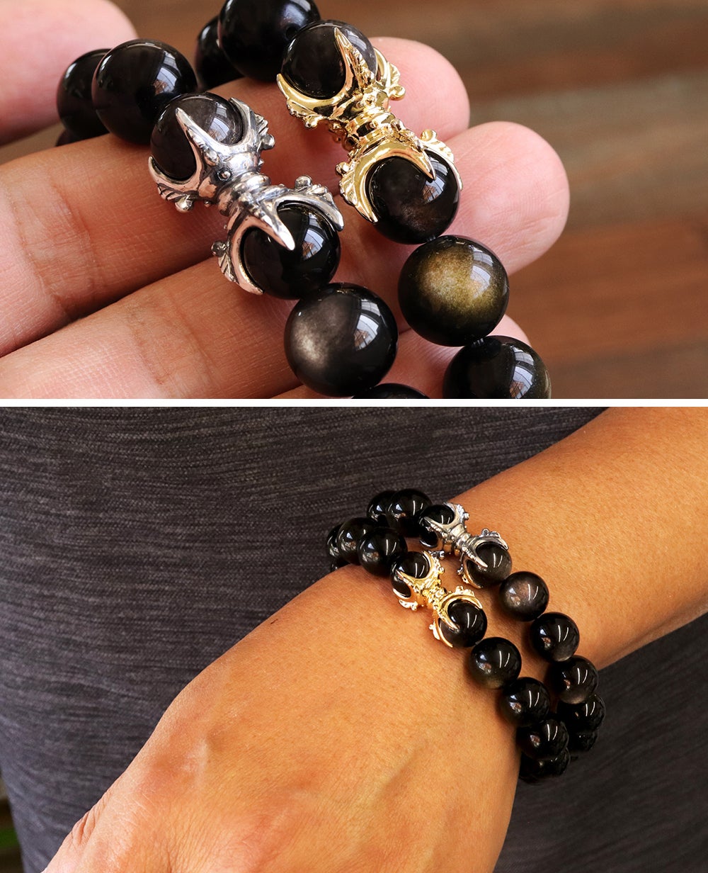 オブシディアンの中で、今回使っている「ゴールデンオブシディアン」と「シルバーオブシディアン」は、含まれた気泡や微粒子が光を反射させることでシラー(輝き)がみられる美しく神秘的な黒曜石です。