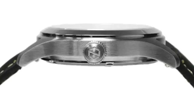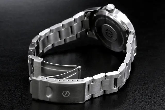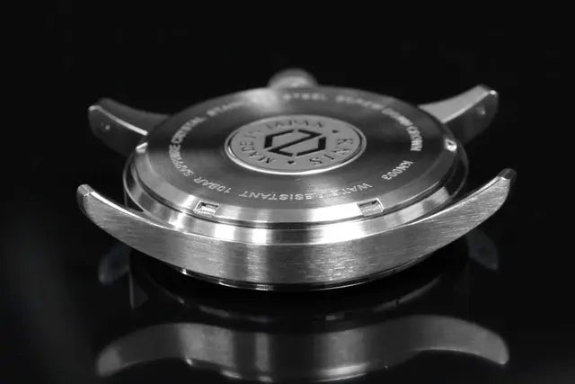 10気圧防水という高い防水性を実現するため、リューズはねじ込み式を採用し、裏蓋はスクリューバック(回転式)を採用しています。ミリタリーウォッチとしてタフな環境でも使用できるよう設計しております。