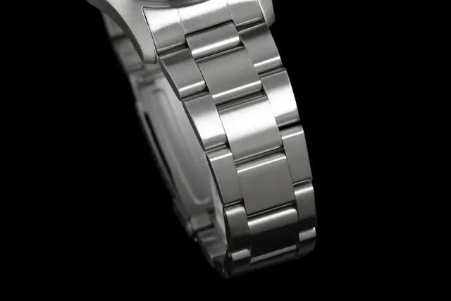 ステンレスベルトはオールステンレス無垢の錆や傷に耐性のあるヘアライン仕上げブレスレット。ブレスレットにもファッション性を高めるための加工を。ポリッシュ仕上げに比べてもコスト面でも高価なヘアラインを選択しました。