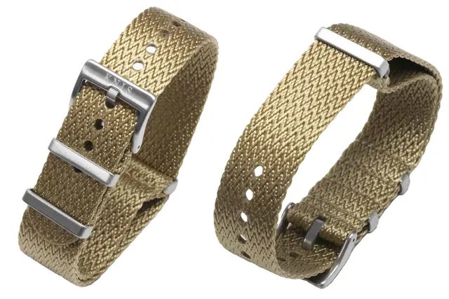 標準のNATOベルトと異なりサメの歯のような「W」のパターンで織られています。細やかに編み込まれた、耐摩耗性にも優れたナイロン素材を使用しています。通常のNATOタイプのベルトよりもしなやかでツヤがある、高級感あふれるベルトです。