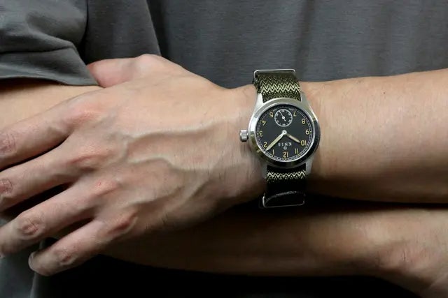 海外ブランドのミリタリーウォッチは40mm以上のケースサイズが一般的ですが、KNISでは日本人の腕に合うサイズ感にこだわり、直径38mmのケースにしました。細い腕にも違和感なくフィットし、ミリタリーデザインながらも上品な雰囲気を持っています。※モデル(男性)の腕周りは16.5cm