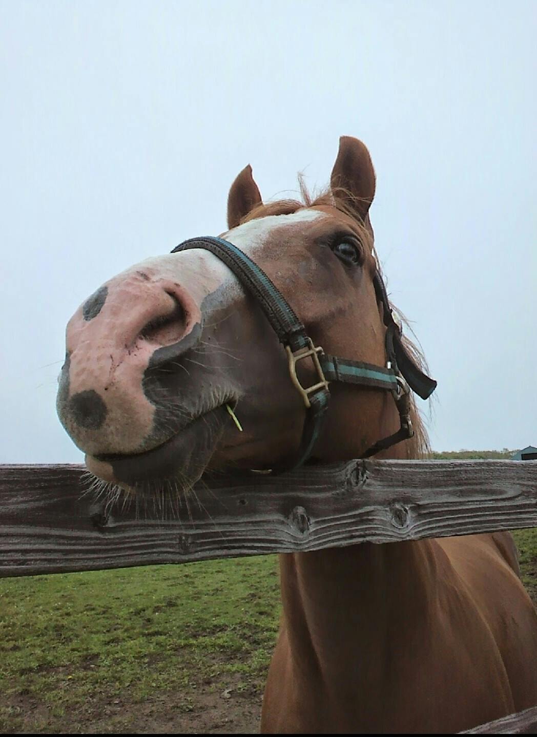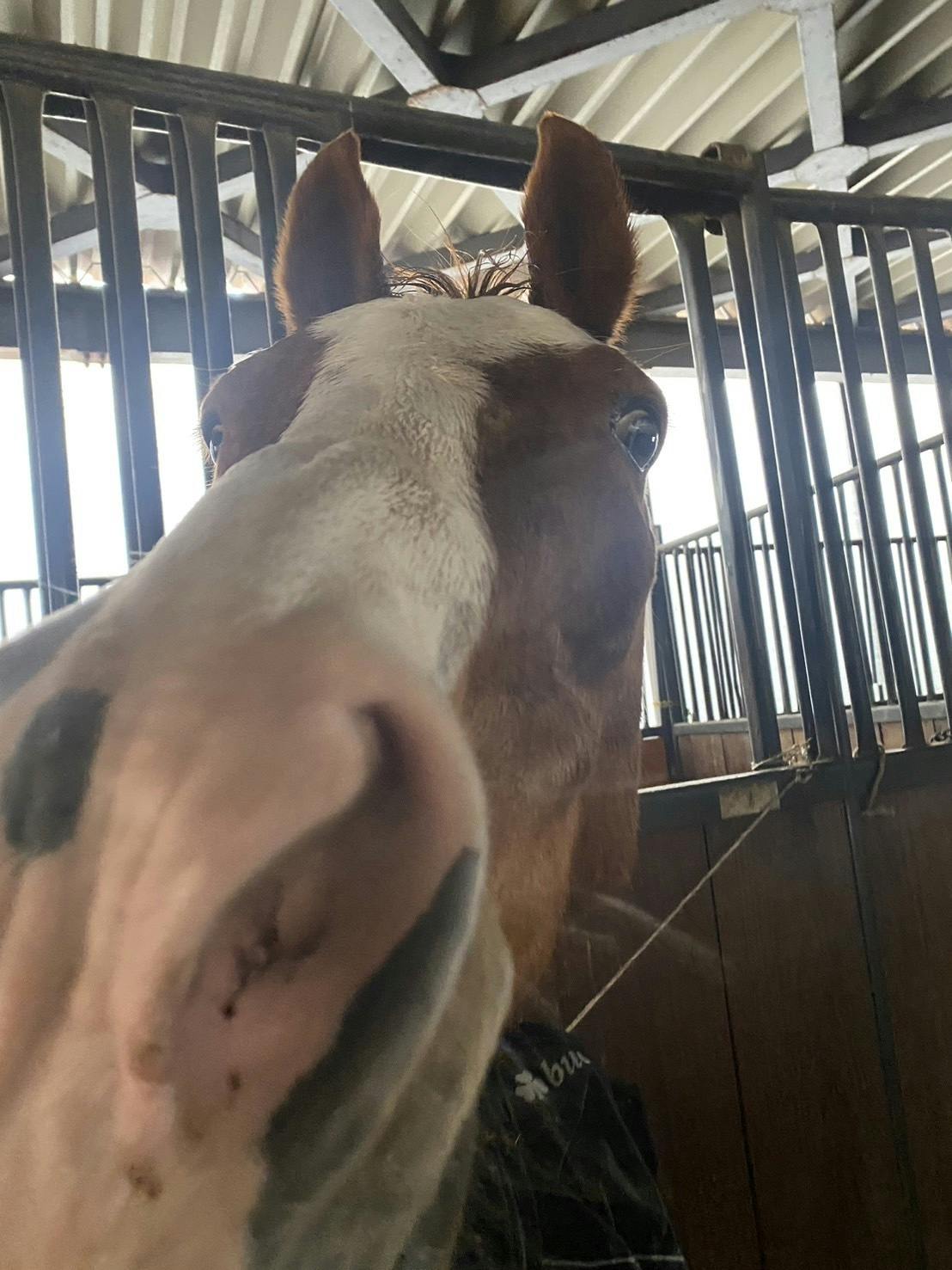 そして、キョウイチも2014年10月ミタカキイタカ、ハートオブハートらと共に北海道から岡山にやって来たのです。牧場でのんびりは4年間でしたね。しかし、キョウイチは岡山に来てすぐに、競走馬時代からのファンであると言う女性がオーナーさんとなり群馬県に移動してしまいました。なので、私の元には、彼の昔の写真データがあまりありません(スミマセン)群馬県では、テレビ番組で女子アナを乗っけて外乗をしたり(笑)、オーナーさんやジュニアと障害の競技をしたり、又、お誕生日をお祝いして貰ったり、愛情いっぱいに可愛がって貰っていたようです。群馬県でも少し移籍したりがあったようですが、どこに行っても皆さんに愛されていました。だから、今も人間が大好き。写真を撮るといつも、ぬ〜んて感じの鼻デカ写りになる、ほんまに可愛いヤツです。