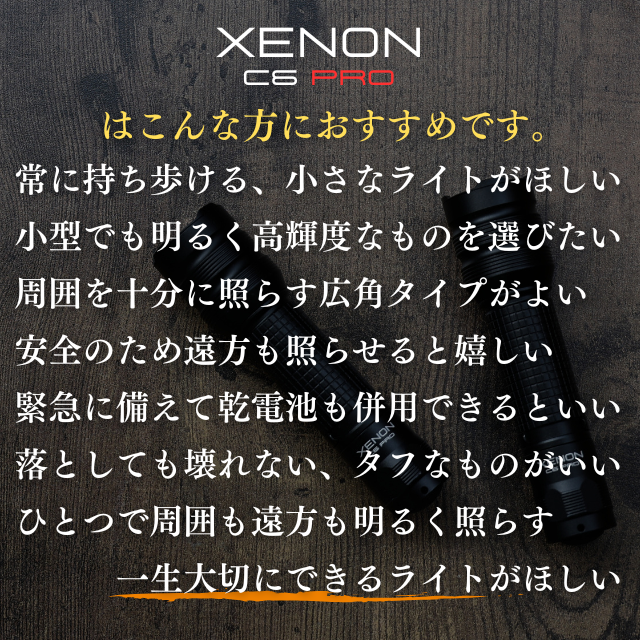 そのような中、今回開発された「XENON C6Pro」は、我々が得意とするLED照射技術を駆使し、前作からさらなる進化を遂げたLED懐中電灯です。