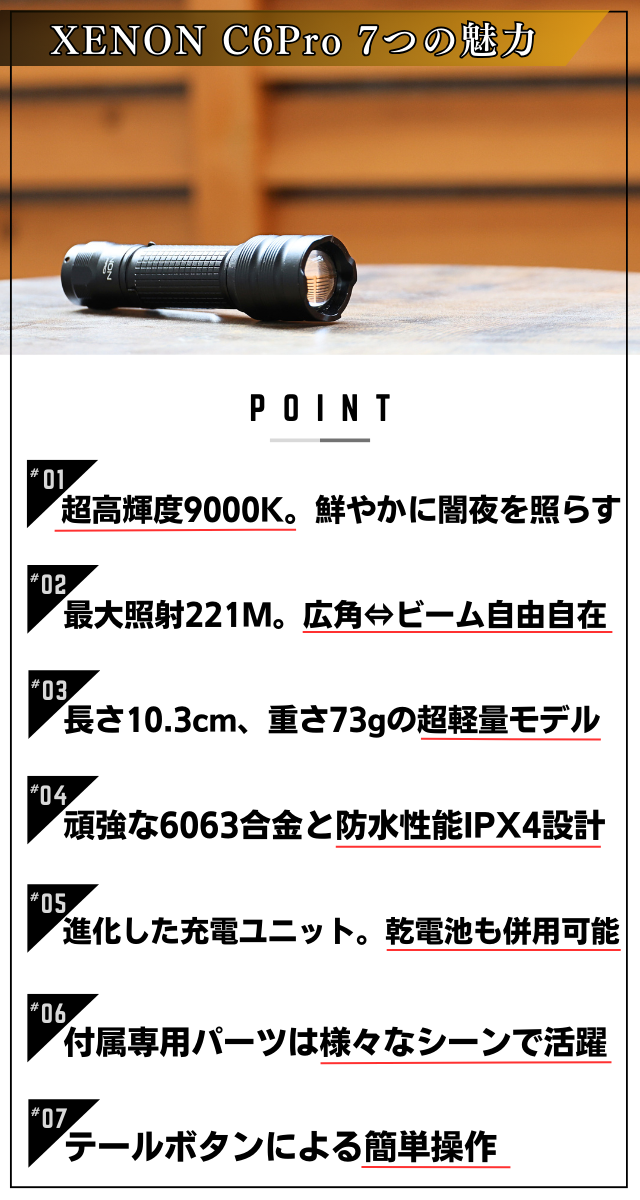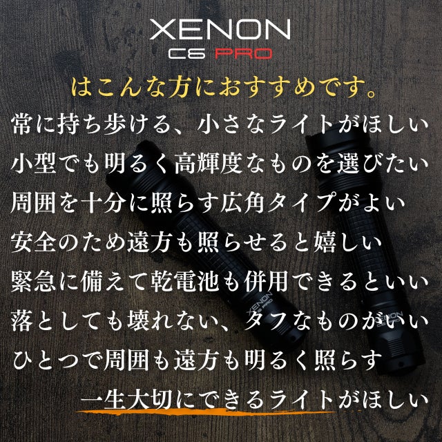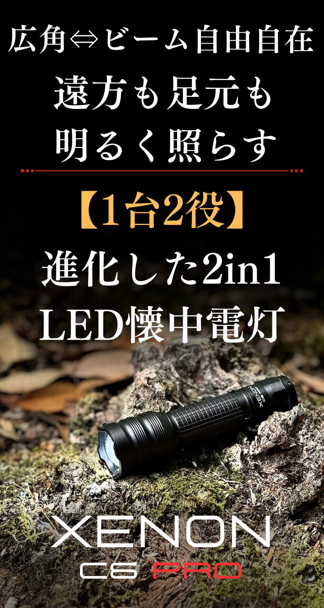 高輝度9000K、長さ10.3cmの小型サイズに広角とビーム照射が切り替わるズーム機能を搭載したXENON C6Proは、圧倒的な明るさと小型化を両立した新しい2in1LED懐中電灯です。
